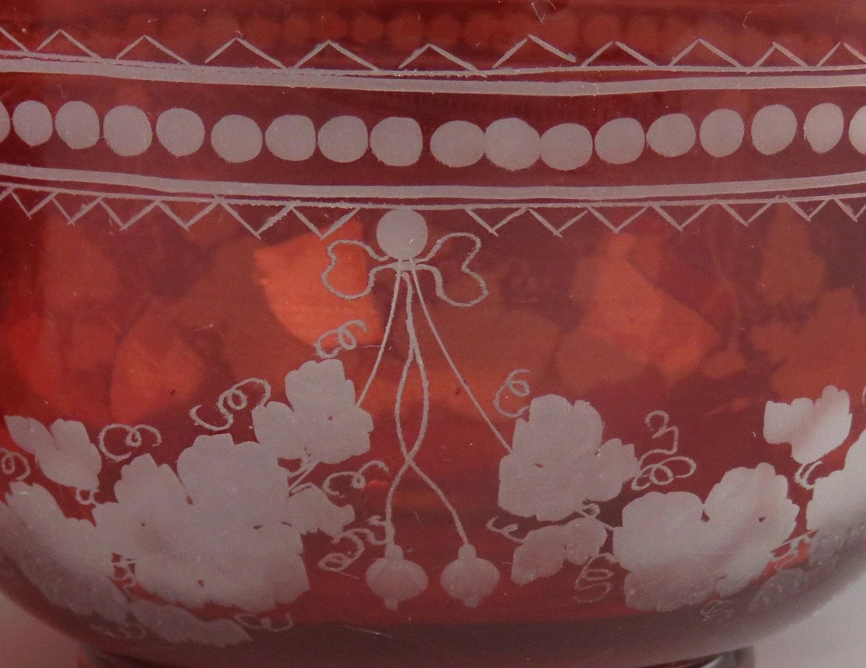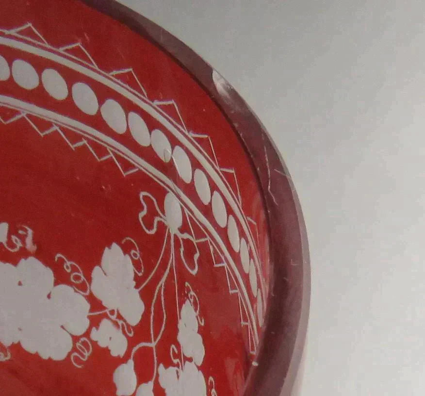 ruby glass with cut and frosted decoration around the sides. The decorations