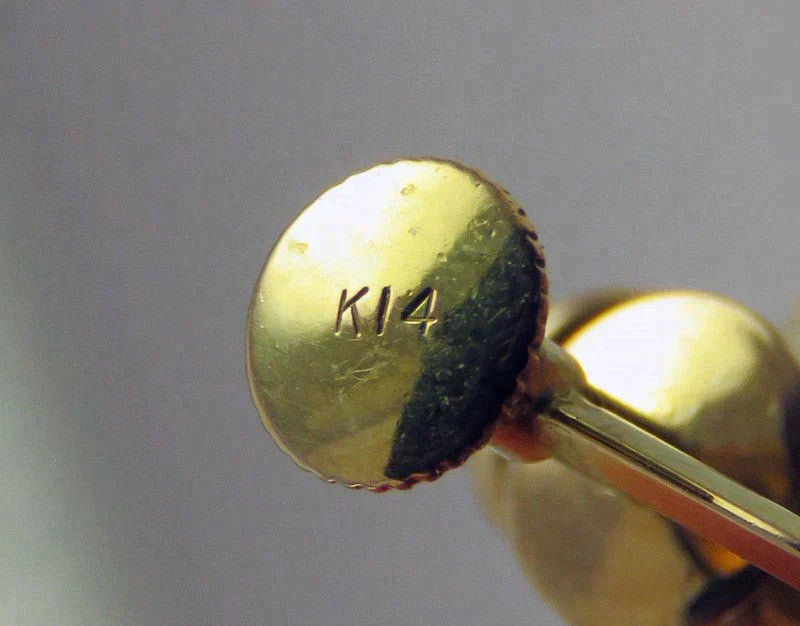 One earring is marked 14K. All gold portions tested and guaranteed to be 14 karat gold purity.