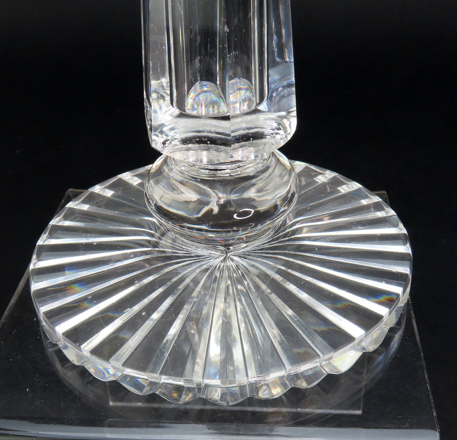 Presented is a fabulous pair of vintage or antique cut glass table candlesticks. These candlesticks date to around the 1910s-1960s, and are likely of American make. The quality of the cut glass work is very good, featuring a tapered, paneled design to the shafts, a rayed starburst to the base, and a faceted knop beneath the socle.