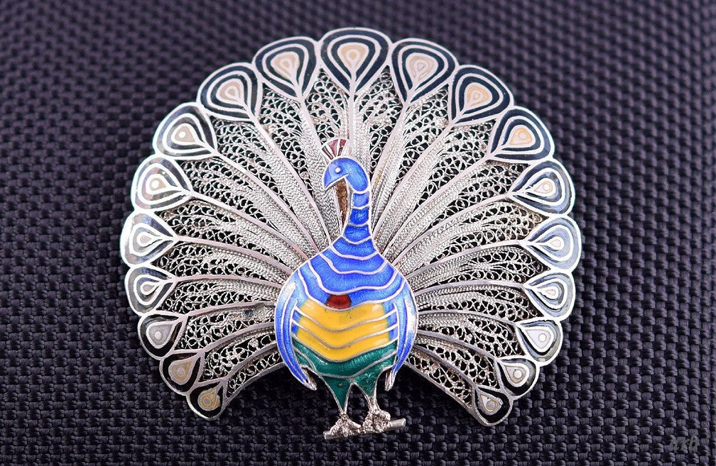 Beautiful Portuguese 833 Purity Silver Enamel Filigree Peacock Brooch Pin