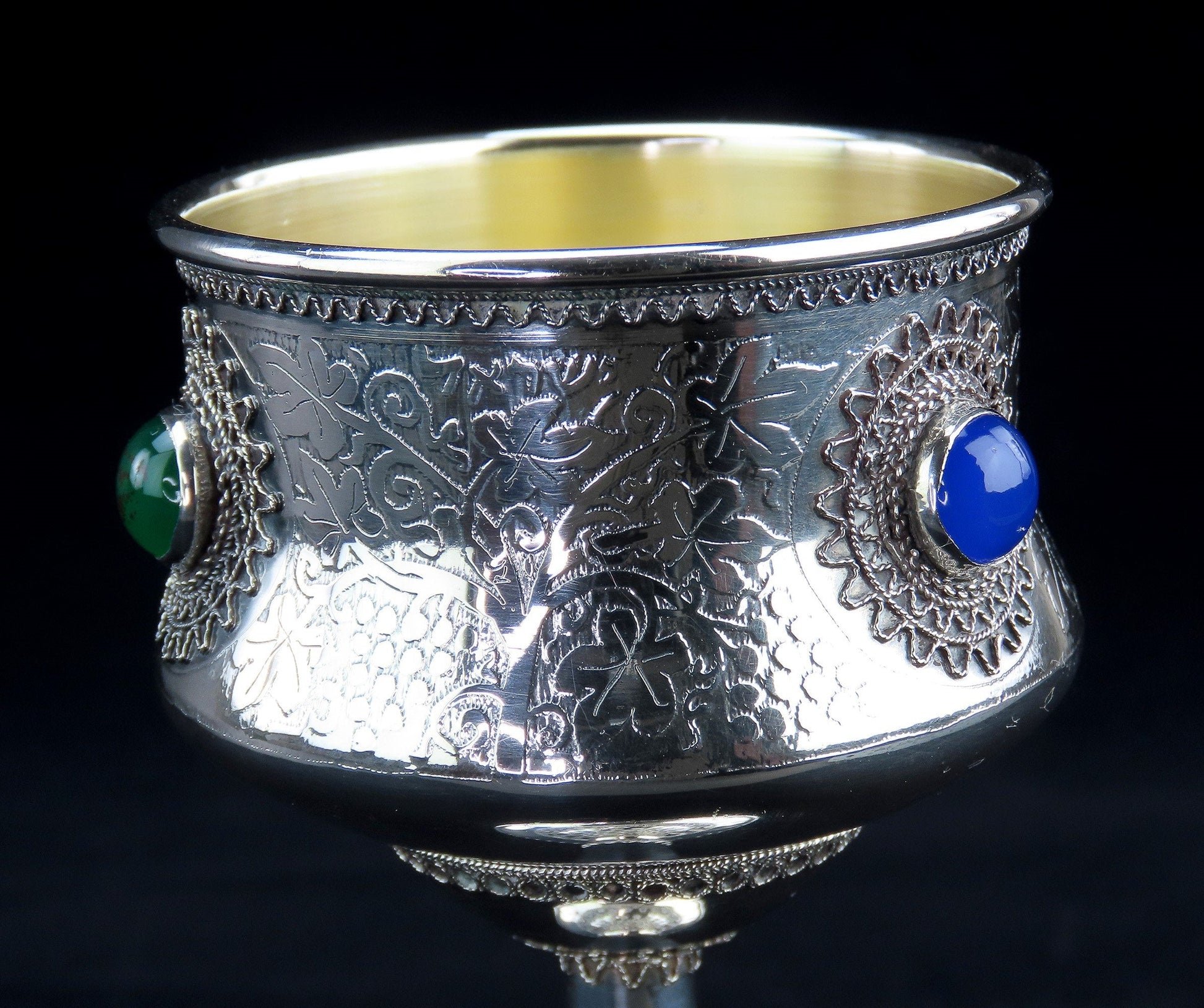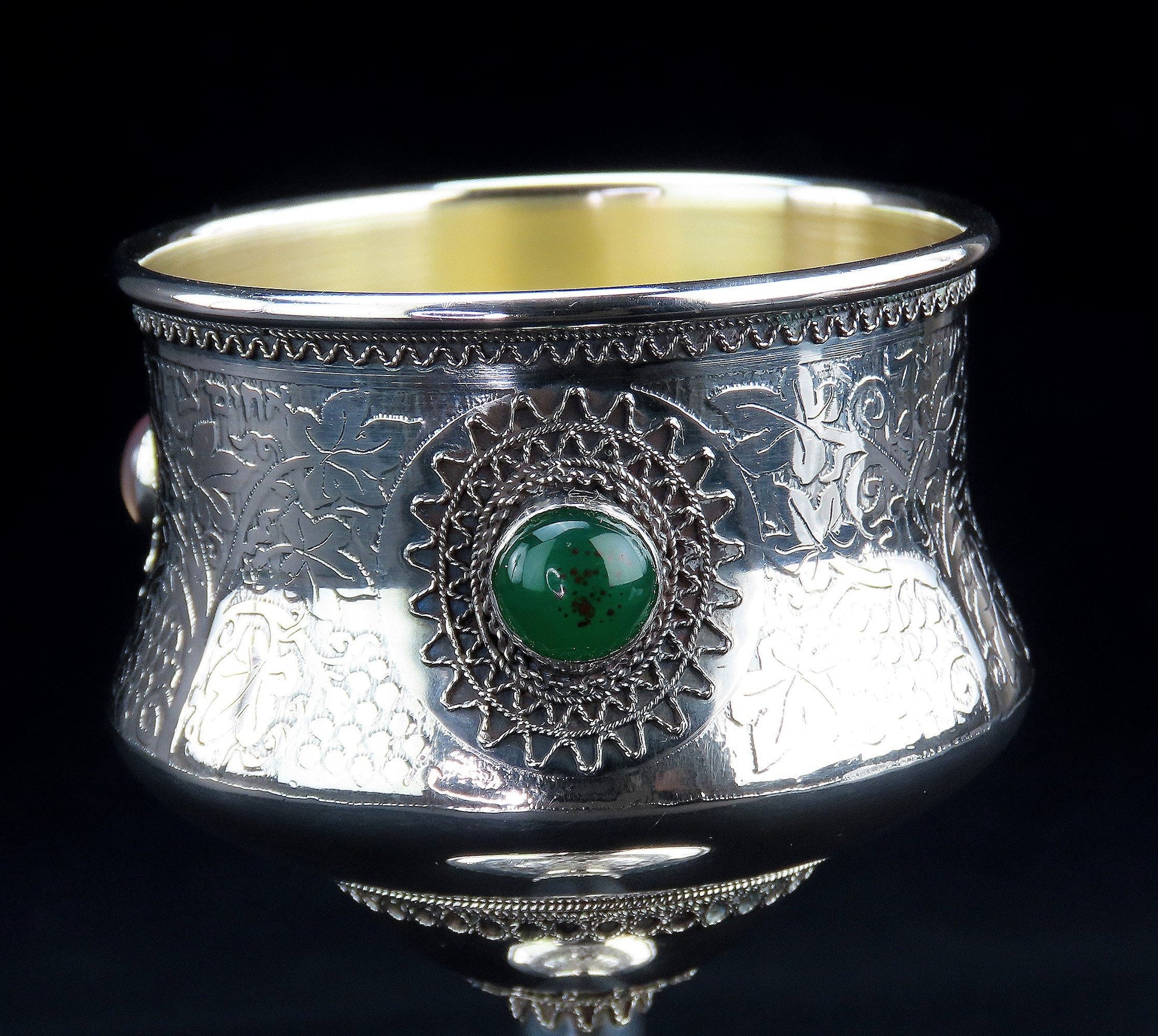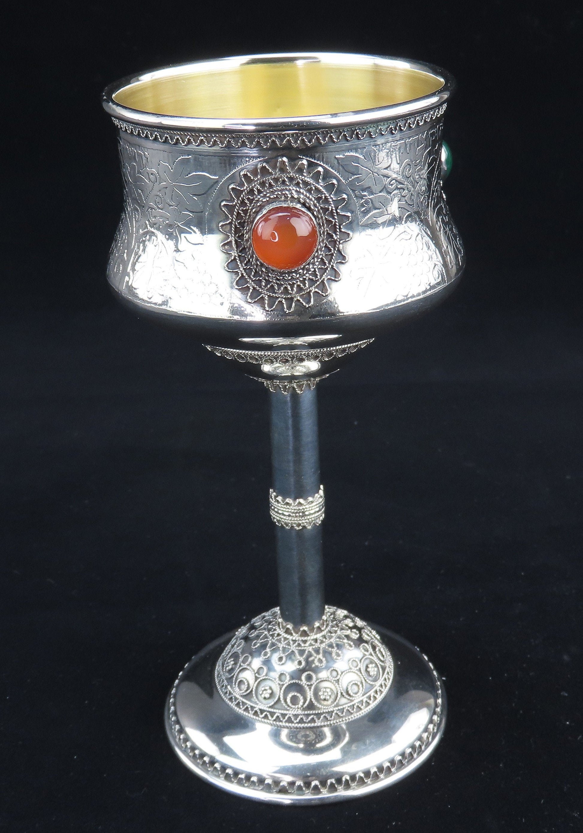 Presented is a beautiful modern kiddush cup with lovely stones. This piece displays three colorful applied stones with intricate wire decorations and engraved trees and vines. The interior has a great gold wash. There is Hebrew writing close to the rim at the top of the trees. This Hebrew displays a Jewish prayer.