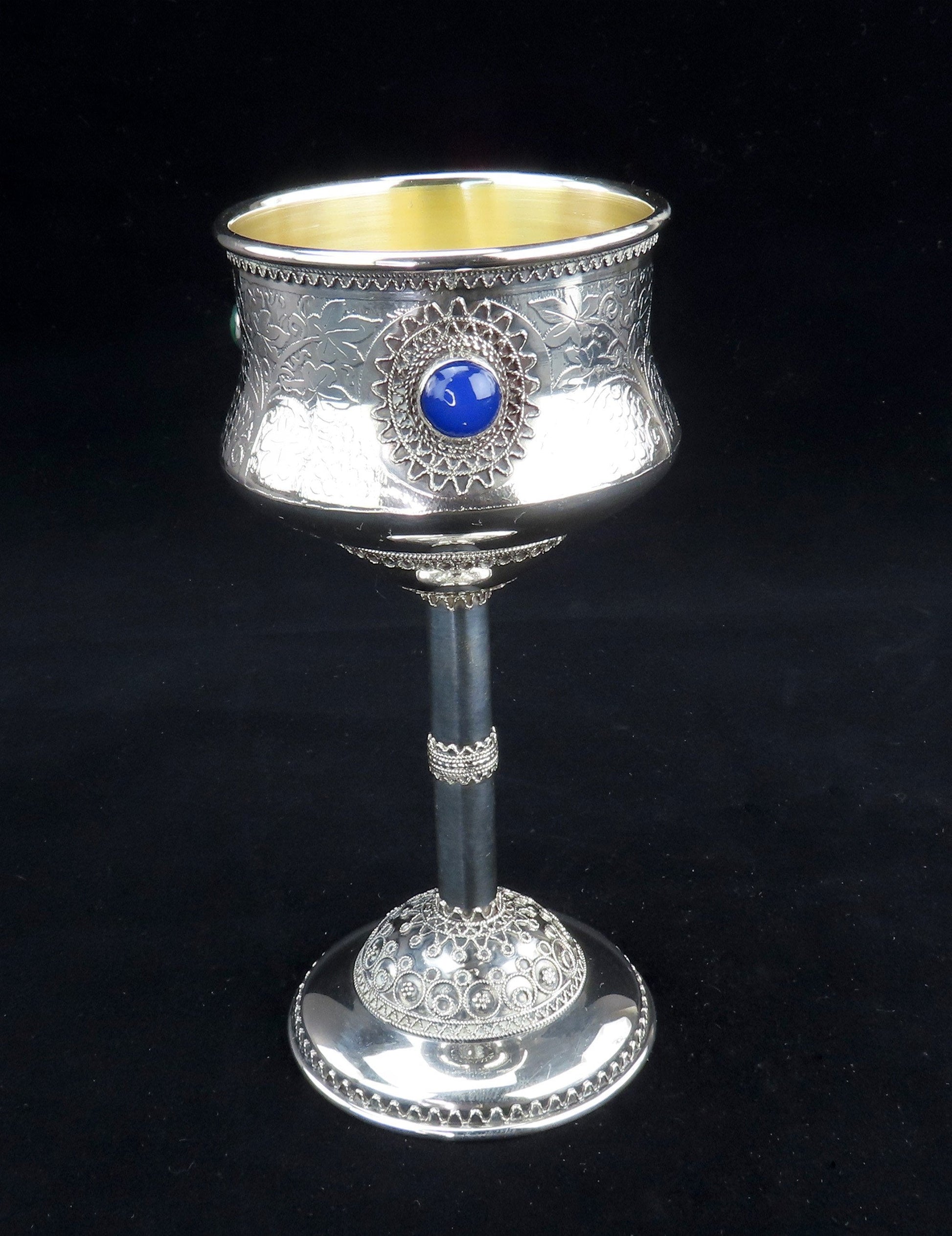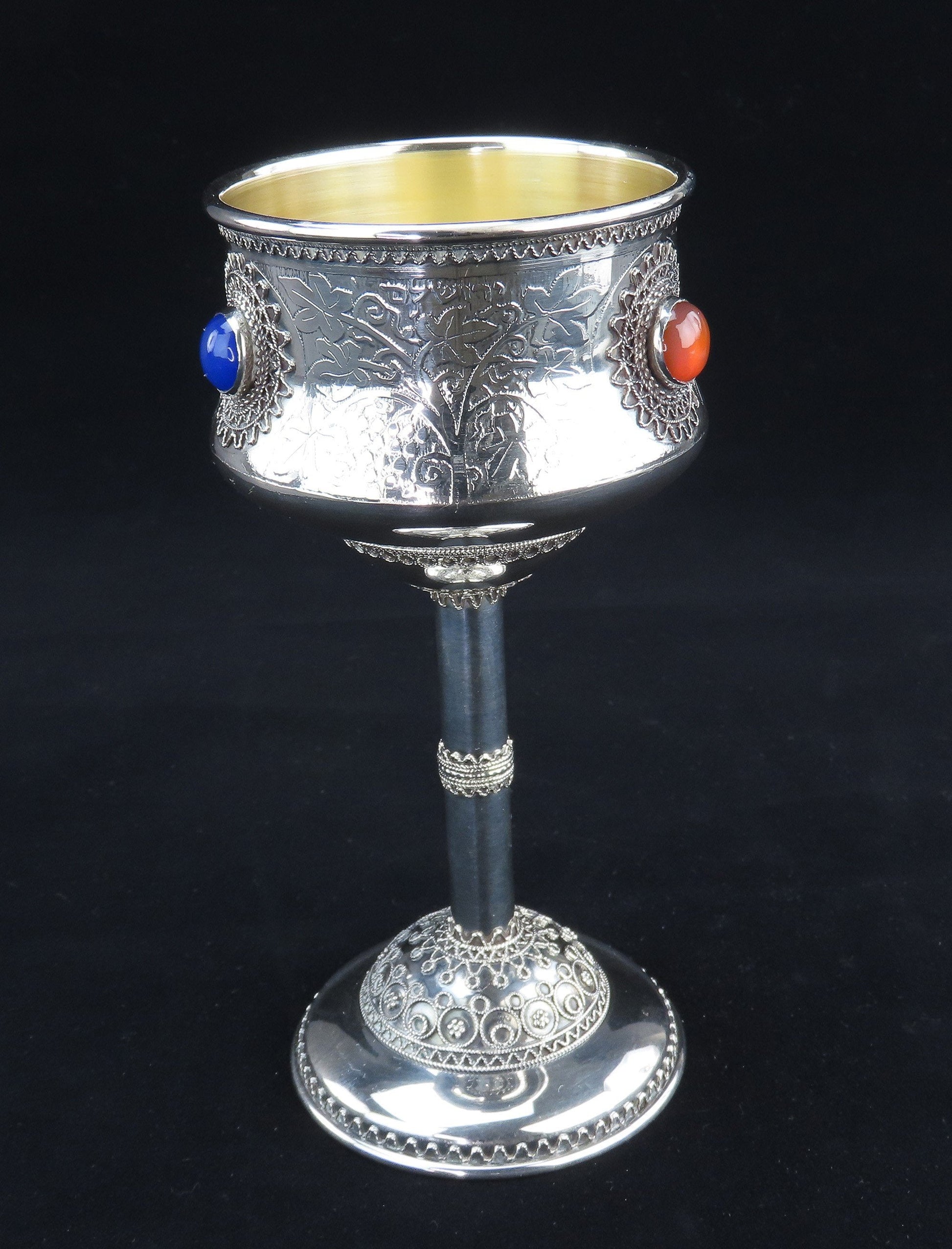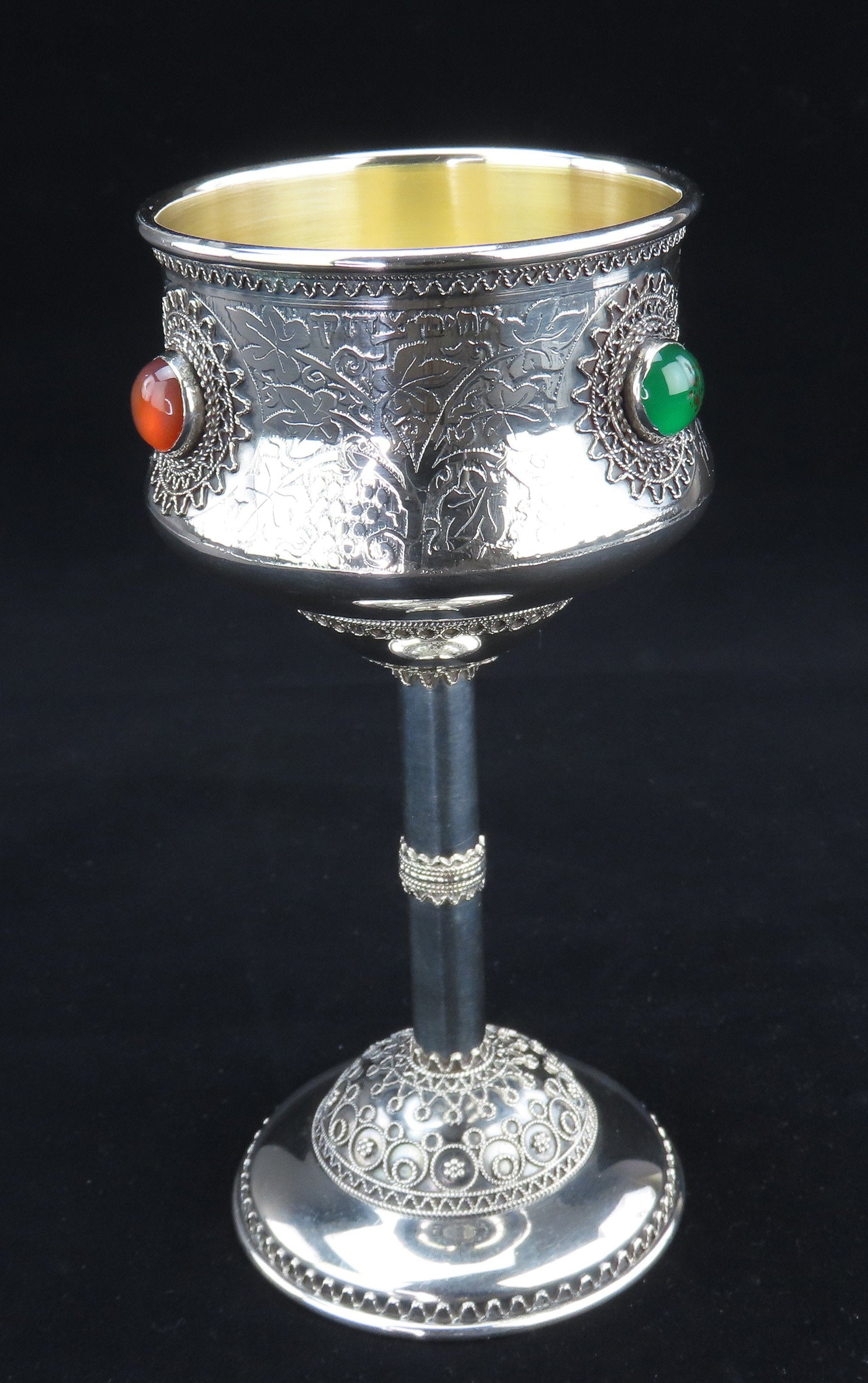 Presented is a beautiful modern kiddush cup with lovely stones. This piece displays three colorful applied stones with intricate wire decorations and engraved trees and vines. The interior has a great gold wash. There is Hebrew writing close to the rim at the top of the trees. This Hebrew displays a Jewish prayer.