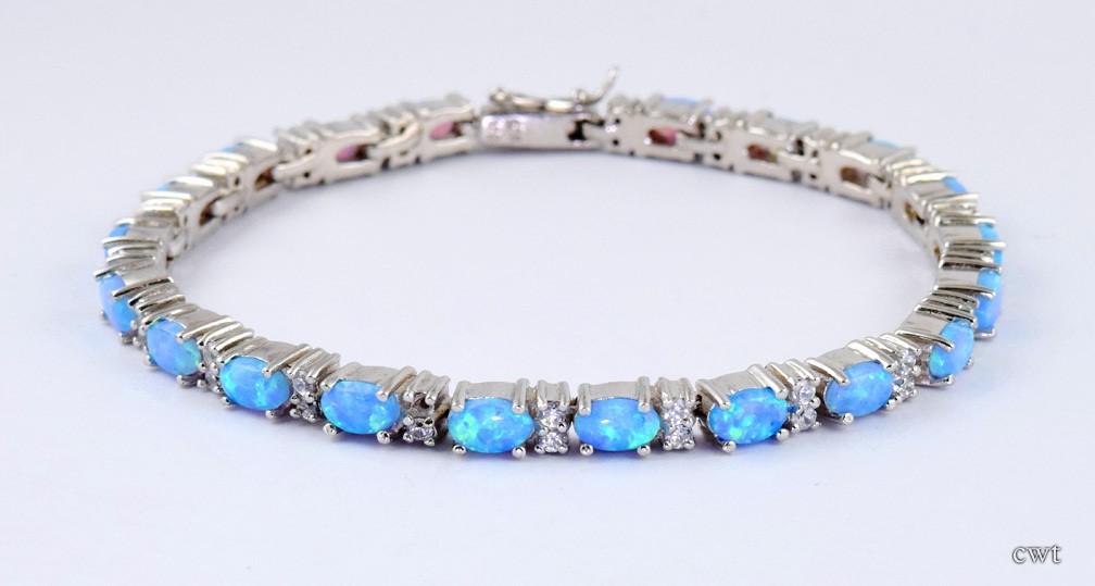 This bracelet has luminescent synthetic opals with two accenting synthetic diamonds on each link.