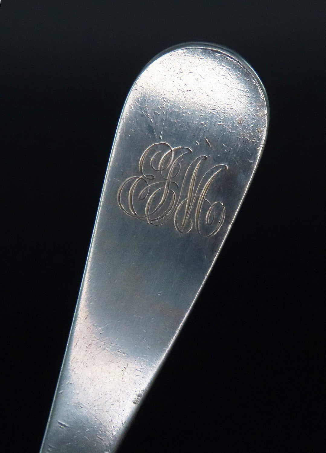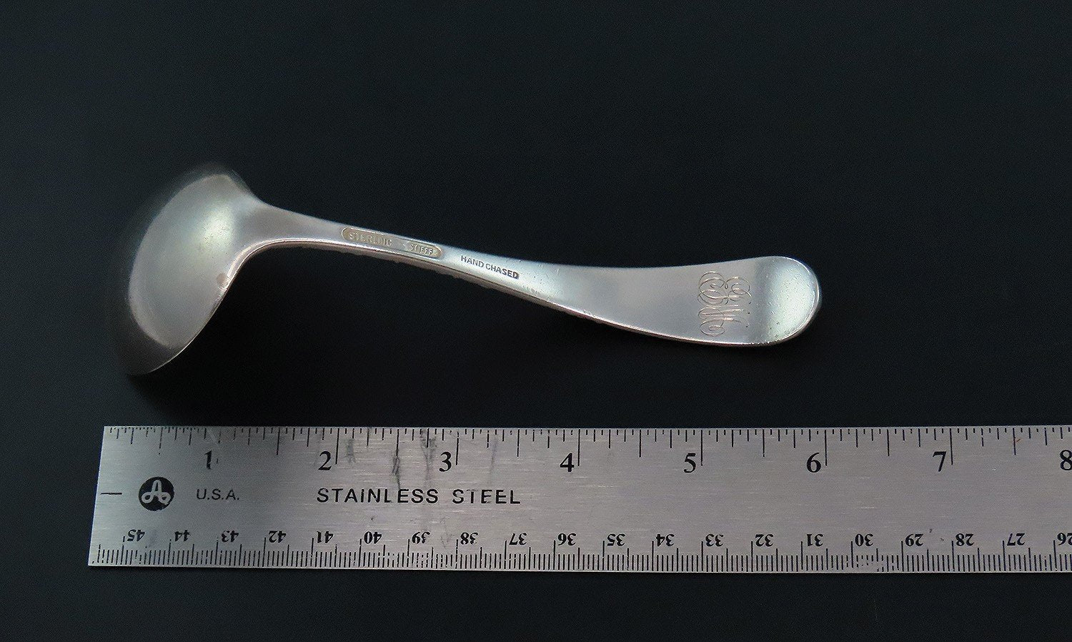 The reverse is marked sterling along with the maker's mark for Stieff and “hand chased”.