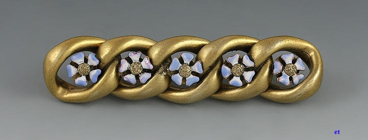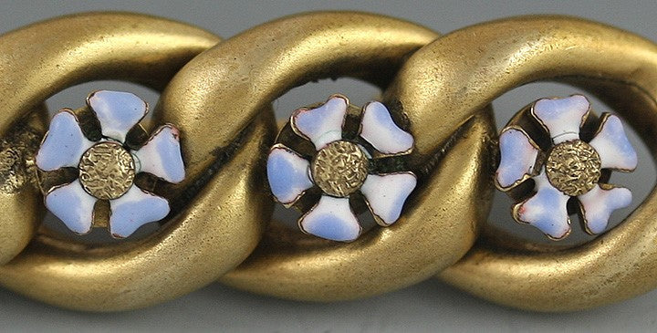 design, with blue enamel flowers set in the openings of the links. The gold has