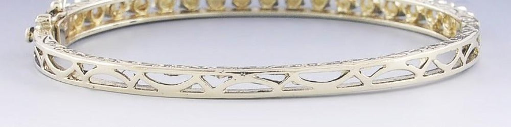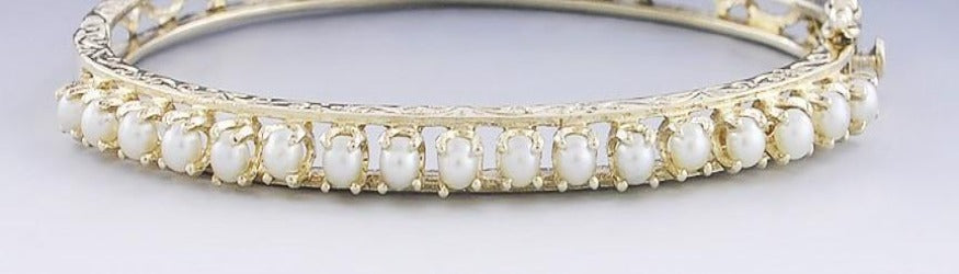 set along the top half with elegant pearls. The sides of the bracelet are finely