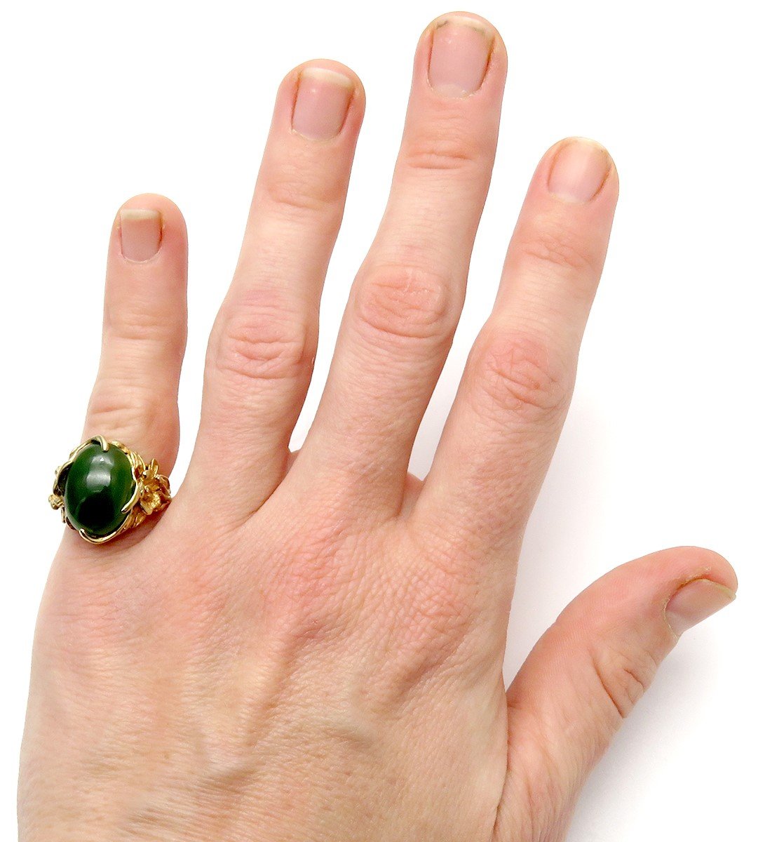 Presented is a gorgeous vintage 10 karat yellow gold and jade ring. The ring is set with an oval cabochon of beautiful nephrite jade, in a rich shade of medium green, with nice interior flecks of darker green and appealing translucence. The jade cabochon measures about 15.1 by 11.8 millimeters. The shoulders of the ring are done in a lovely floral design, well executed with hand carved or engraved detailing.
