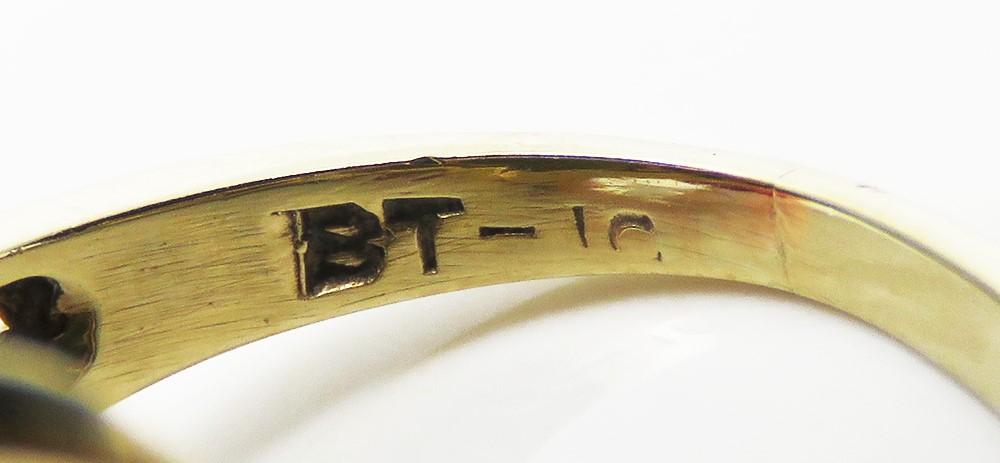 The ring is stamped with a partially worn 10k mark, as well as a maker's mark or other mark. We have tested this piece with nitric acid and guarantee it to be 10 karat gold.
