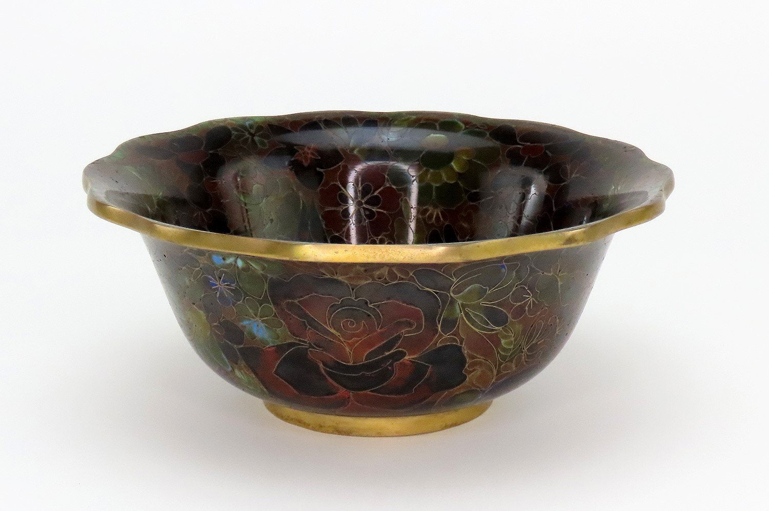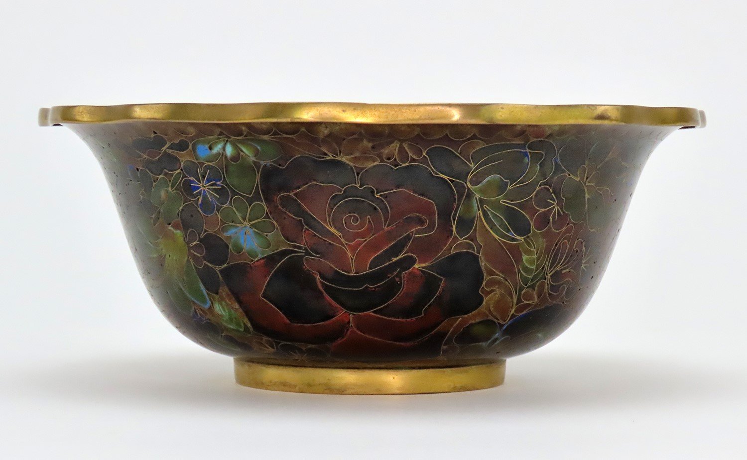 Presented is a beautiful cloisonne bowl, likely of Chinese or Japanese make, dating to the mid 20th century. The bowl is wonderfully decorated with rich floral design including roses, peonies, and other more stylized flowers in a very distinctive palette of reds, blacks, greens, blue and amber shades. The wirework delineating the design is gilt or highly polished brass, as are the rim and foot rim of the bowl. Very eye-catching piece.