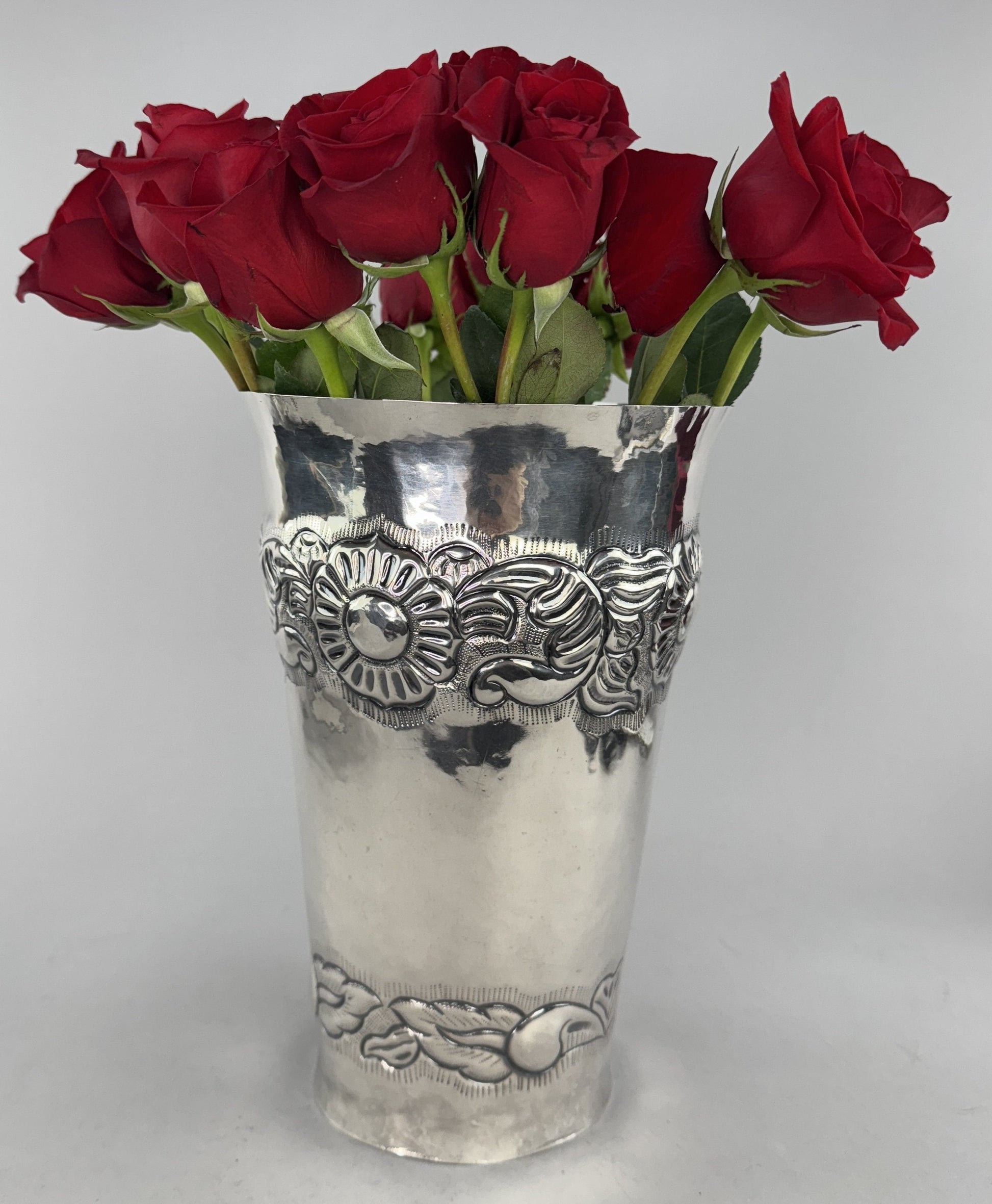 Presented is a very impressive vintage Peruvian sterling silver vase, dating to around the 1950s-1960s. The vase is made in a very classical form, overall wide but tapering to the base and featuring beautifully hand chased decoration around the shoulder and bottom. The chasing is well done, depicting bold round flowers and scrolled foliage at the top and smaller leaves and petals around the bottom, all against a background of finely engraved texturing, so the details really pop. The rest of the silver has a hand hammered finish, which catches the light very attractively. This is a very striking piece, perfect for a large size bouquet.