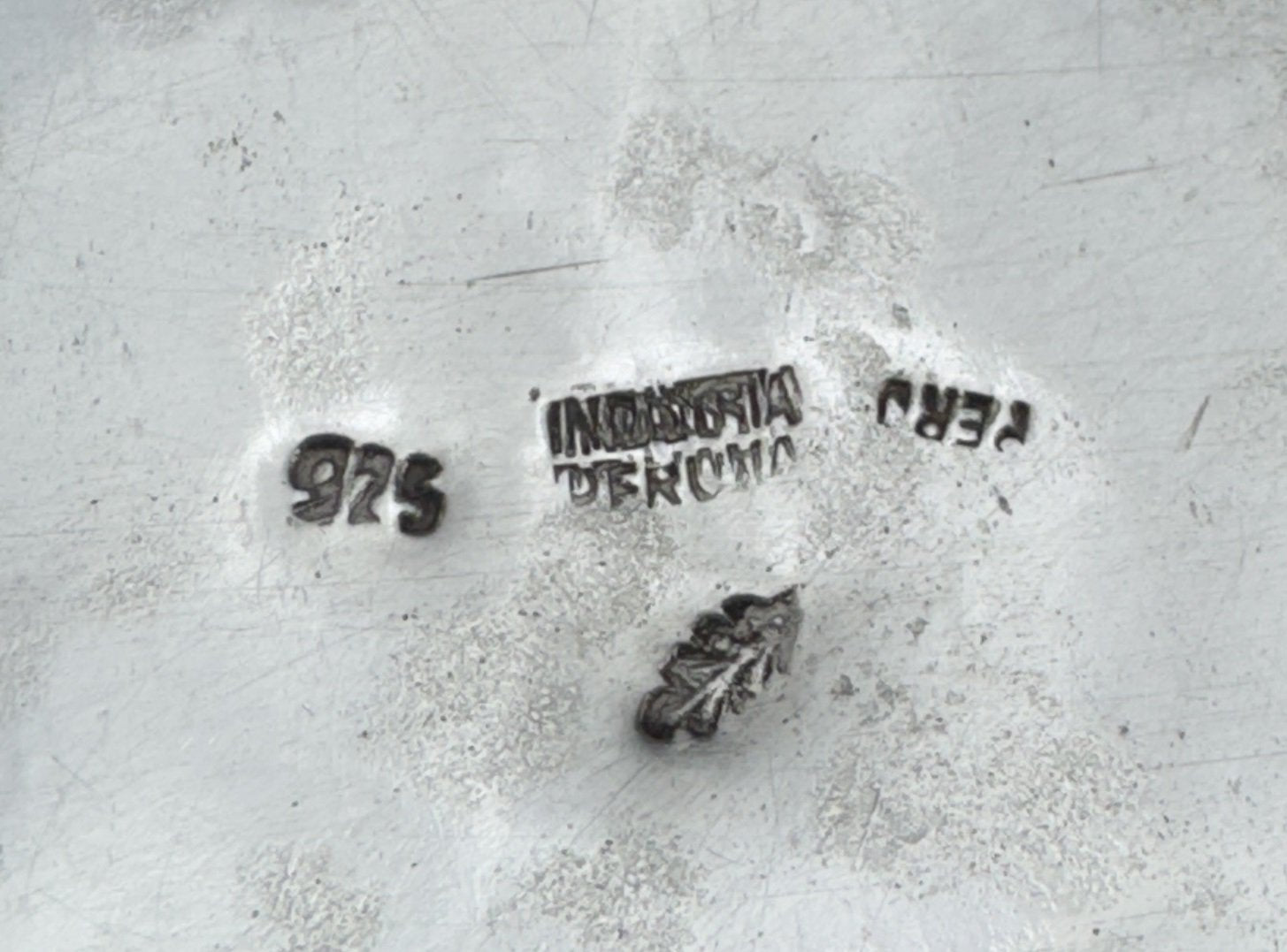 This piece is stamped on the underside with 925 for sterling silver Peru, an 'Industria' mark that is doublestruck, and a maker's mark in the shape of a leaf.