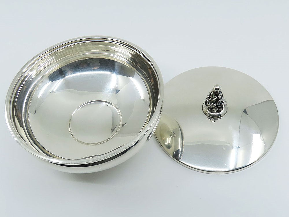 Presented is a superb quality sterling silver covered dish/round box, dating to around the 1940s-1950s. This piece was made by Mueck-Carey, a well-regarded New York silver company later absorbed into Towle. The box is made in a lovely form featuring a band of floral openwork decoration around the upper portion of the foot, very much in the style of La Paglia pieces. The finial of the lid matches, done in the form of a little taper of flowers. Great as a dresser box, covered candy dish, etc.