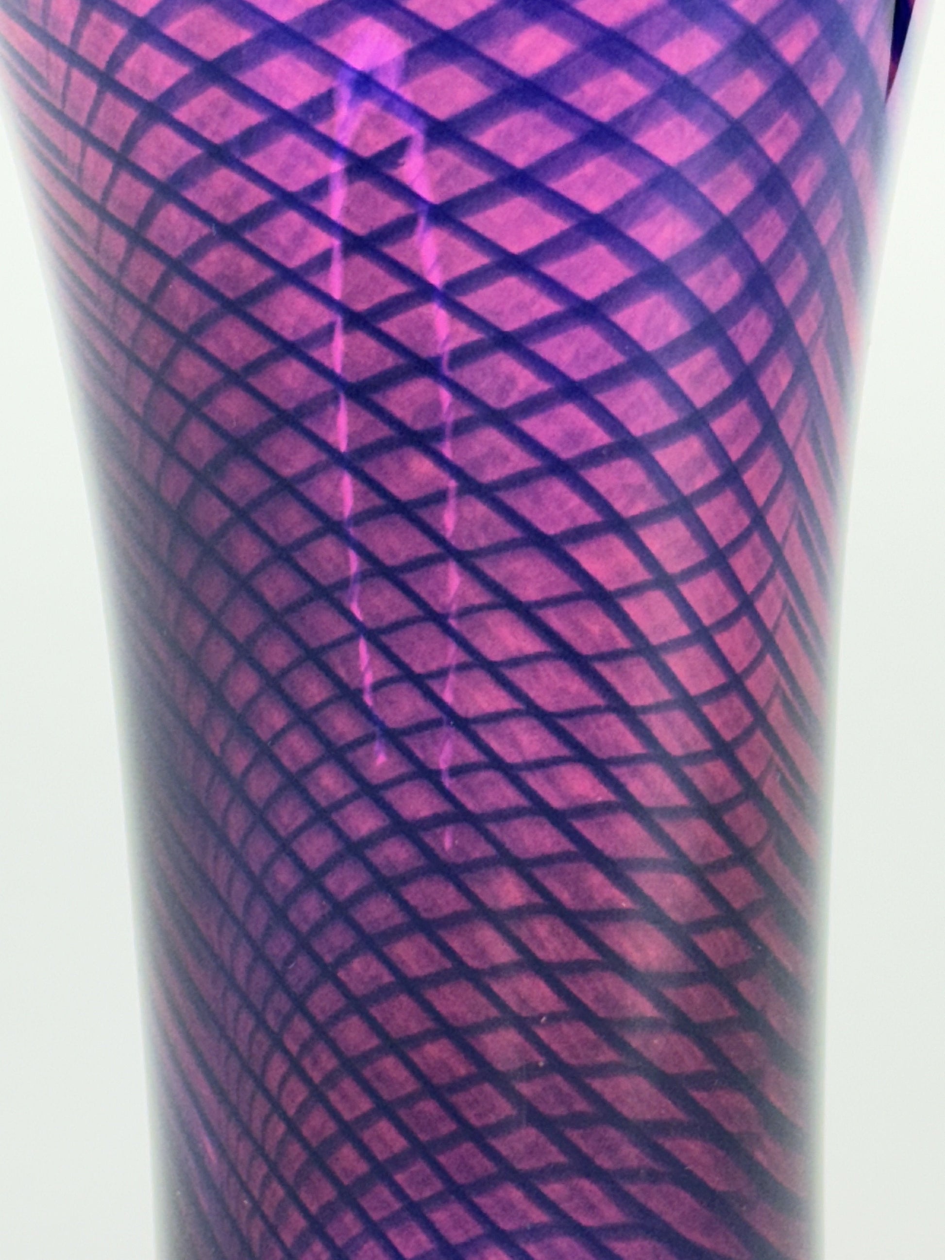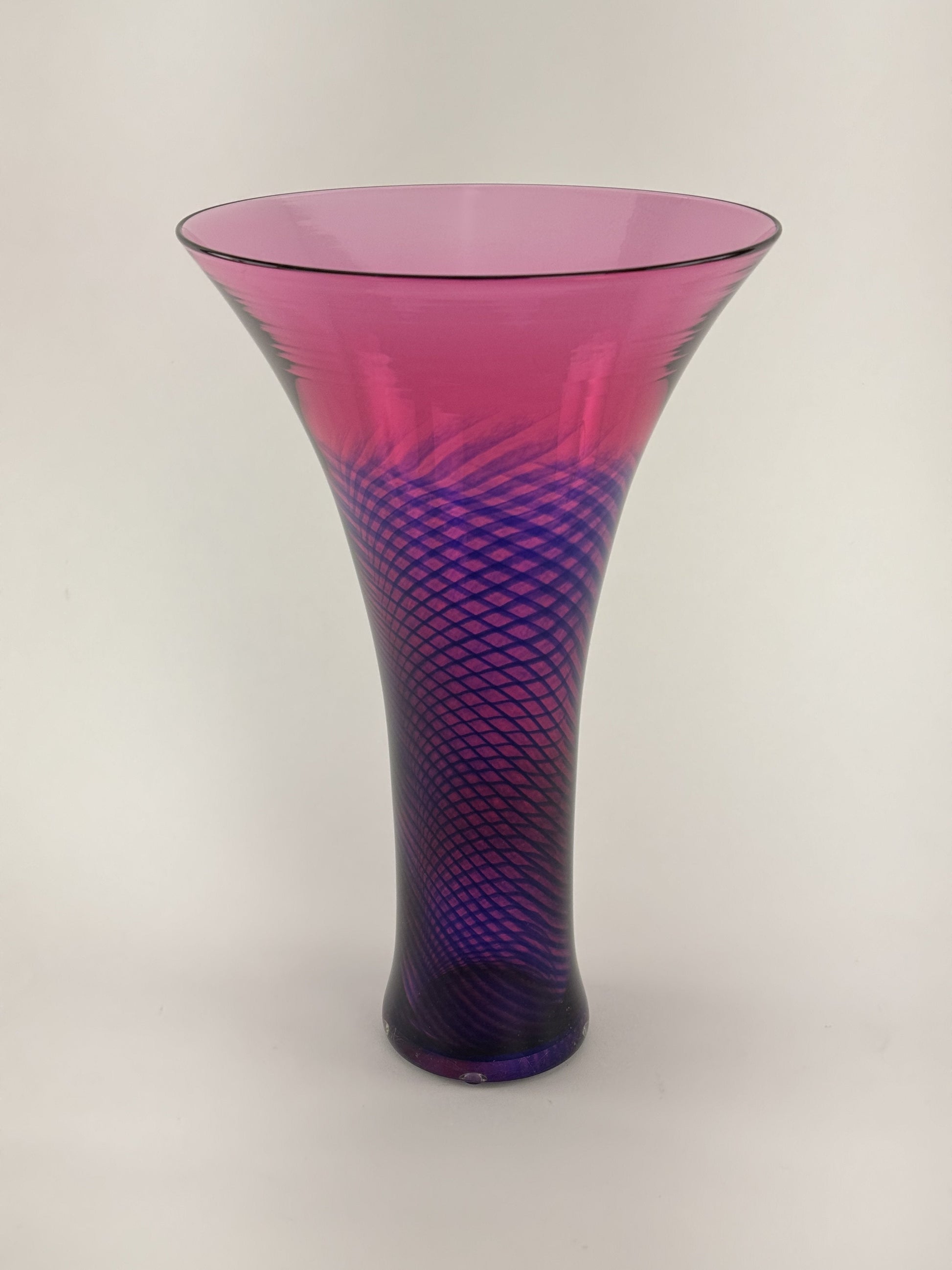 Presented is a beautiful art glass vase by Young & Constantin. This is a relatively contemporary piece, likely made in the second half of the 20th century. The glass is made in an elegant trumpet form, in wine red/purple glass with a swirled interior weave pattern in blue. The piece stands at a very impressive height, and the mouth is quite wide, so it makes a very eye-catching piece and would be even more so with a sizable floral arrangement, fresh or dried. The color is very vibrant, making this a very appealing piece.