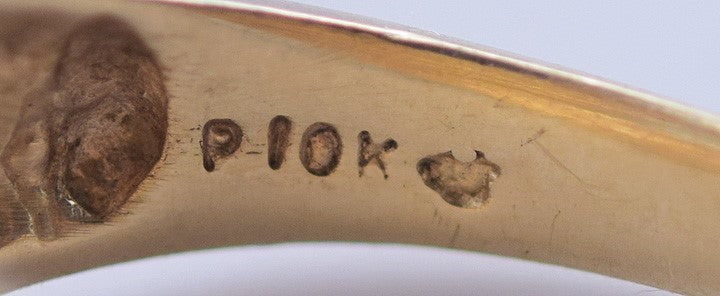 The ring is marked 10K on the inside of the band. We have tested it with nitric acid and guarantee it to be 10K gold. The total diamond weight is approximately 30 points or 3/10 of a carat.
