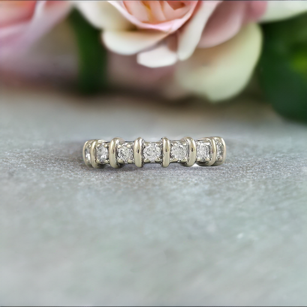 Presented is a delightful 14 karat white gold and diamond anniversary band. The ring is set with 8 modern round brilliant cut diamonds, each approximately 6 points each. We estimate a total carat weight in diamonds of around 50 points or 1/2 a carat. The diamonds have I-1, possibly SI-2 clarity and H-I color. The ring was made in America and is a modern ring.