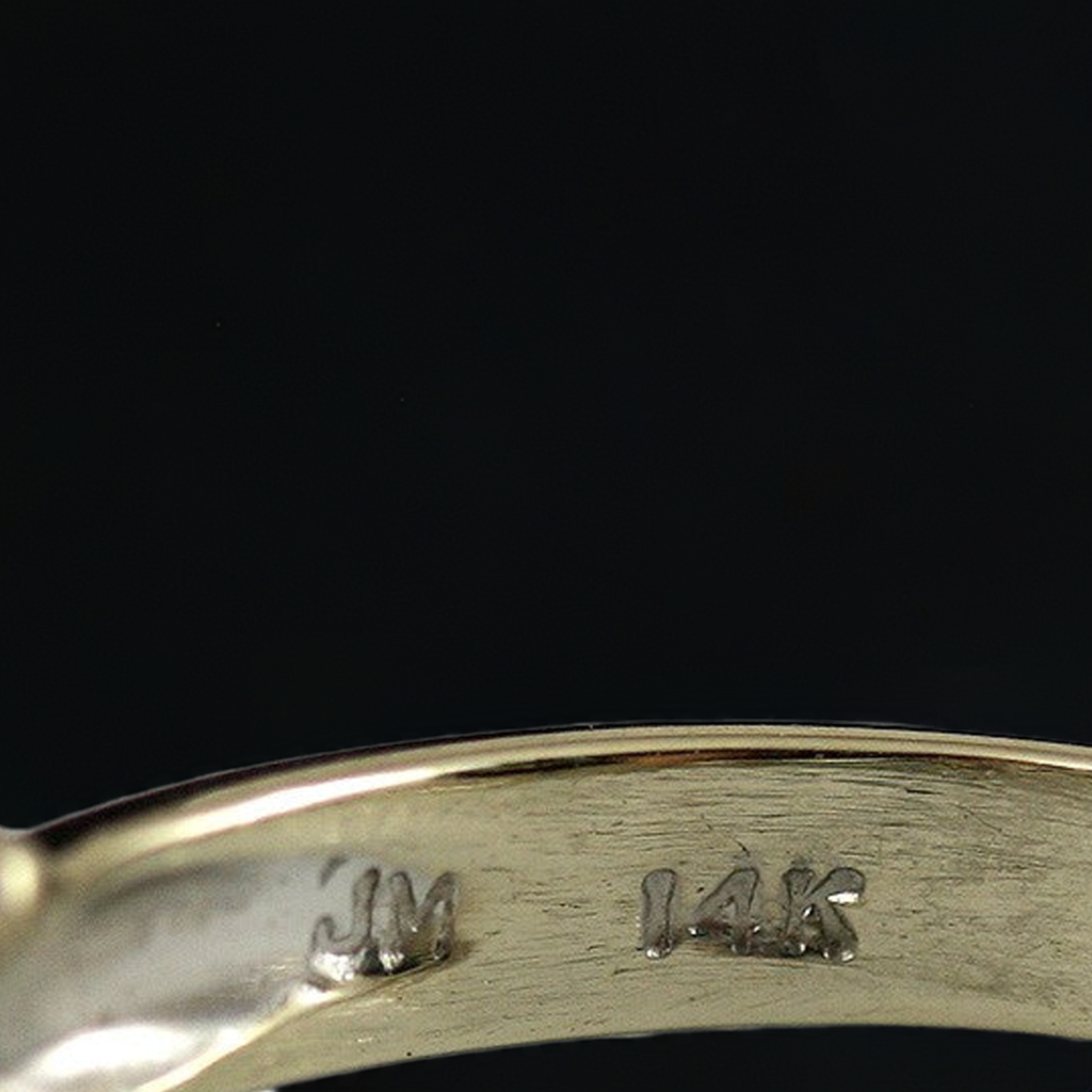The ring is marked on the inside of the band with 14K for 14K gold and JV. We have tested it with nitric acid and guarantee it to be 14k gold.