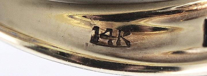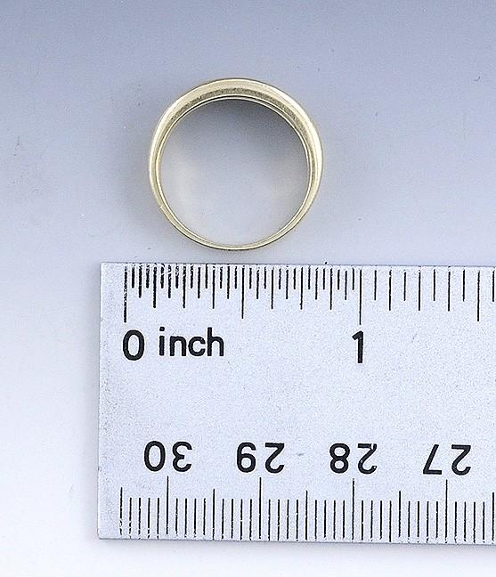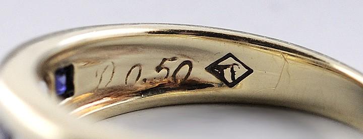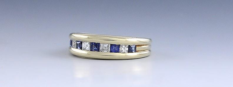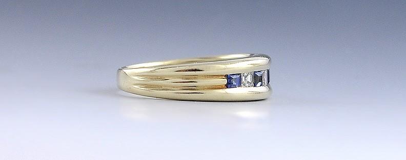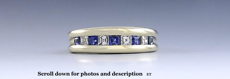 The ring is in great condition. The diamonds and sapphires are securely set and all intact with no chips. The band has no breaks and no repairs. This piece is stamped and guaranteed 14k, as well as having a maker's mark and a mark of D 0.50 indicating a total diamond weight of 50 points, or half a carat. The ring is a size 5 1/4. The ring measures about 5.2 millimeters at the widest point and about 2.6 millimeters at the narrowest point of the band. The ring weighs 3.4 grams.-jm