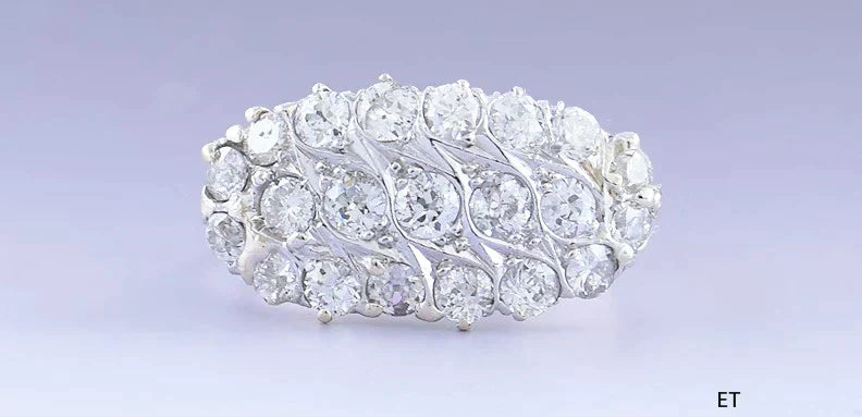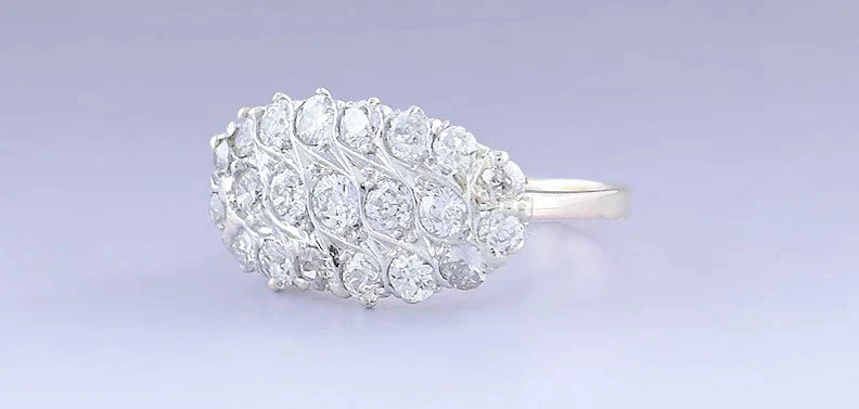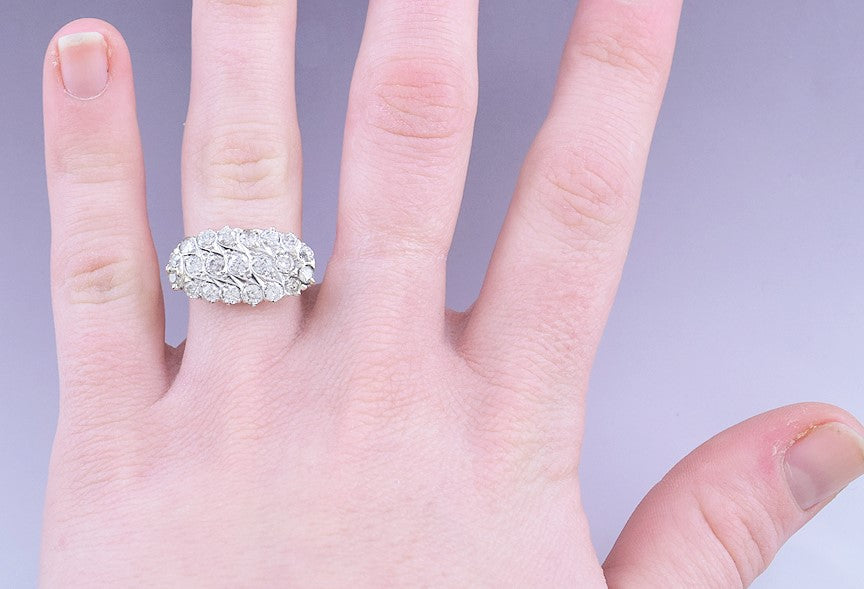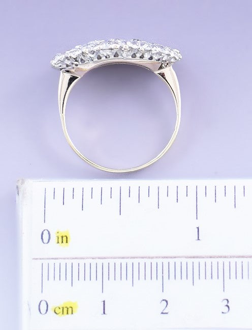 Presented is a stunning 14 karat gold and diamond ring. This is an American ring, dating to around 1890-1910. The ring is set with 21 diamonds. Most of these are old mine cut stones, but at least one is a modern brilliant cut, and therefore likely a replacement. The central five diamonds are about 10 to 12 points each in size, of SI clarity and G/H color. The surrounding diamonds vary more in size, with six being about six points each and the remaining 10 being