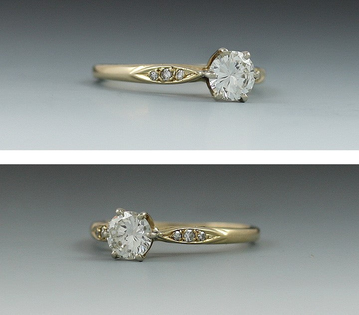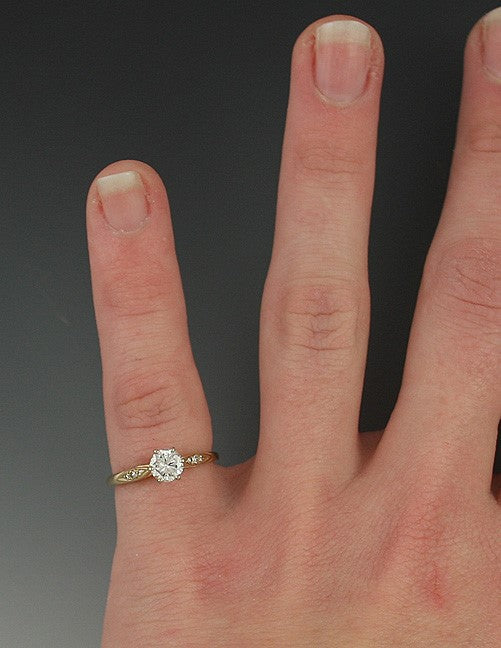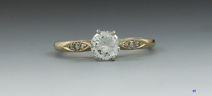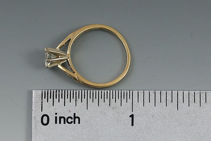 Presented is a lovely diamond and 14K gold ring. The beautiful diamond solitaire is modern brilliant cut, 5.28 millimeters in diameter, about 3.27 millimeters in depth, and at least ½ a carat. The clarity is SI clarity and eye-clean. The color is H. Six smaller diamonds flank the solitaire and are set into delicate marquise patterns in the band.