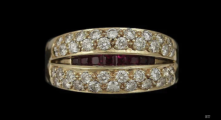 Presented is a wonderful quality, heavy weight 14K gold, diamond and ruby ring. The ring is topped with a row of 8 square cut rubies at the center with 38 modern round brilliant cut diamonds above and below. The diamonds are approximately 4 points each, for a total diamond weight approximately 1.5 carats. They are really, really high quality stones with VS to SI1 clarity and E-F color. The rubies are fabulous stones as well with vibrant, deep blood red color and excellent clarity. The stones are securely set in a heavy yellow gold mounting. The gold setting has an interesting construction with a hinge underneath. Apparently at one time the portions of the ring that are set with diamonds could pivot outward and go completely to the other side, but it does not pivot anymore. Everything is soldered into one position, as you currently see it. The setting is very solid and secure.