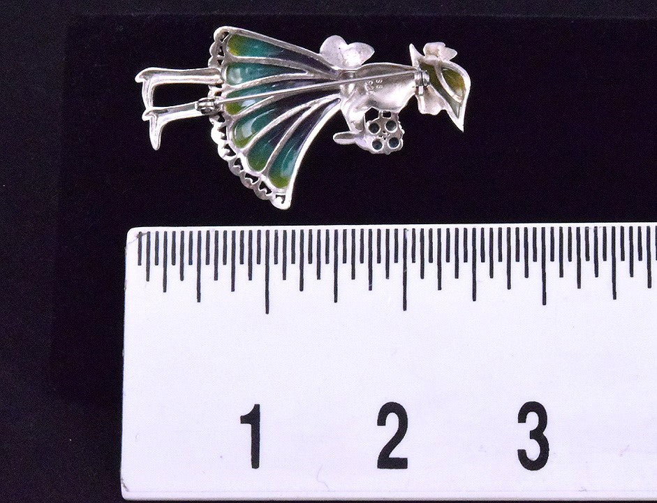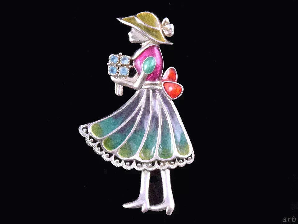 Brilliant Sterling Silver Colorful Plique-a-Jour Pin of a Girl and Flowers