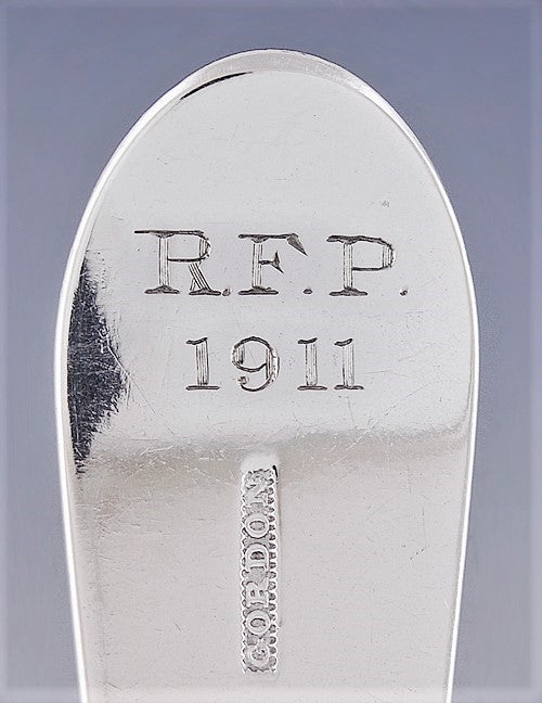 Presented is a great pair of American coin silver serving or table spoons. These spoons date to circa 1795-1803 and were made by Alexander S. Gordon. The spoons are done in a simple, traditional style, with a distinctive downward turn to the end of the handles. The spoons have an old monogram of F in elegant script on the front of the handles, as well as a monogram of RFP and 1911 on the back.