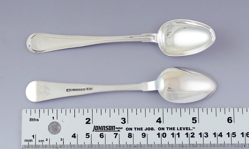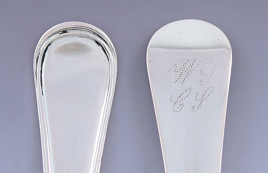This set is in great overall condition. There is still a little black in the details of the pattern, and the spoons could be cleaned up further, but we have opted to leave them as they are. There are no splits, no breaks, no dents, no monogram removals, and no repairs.