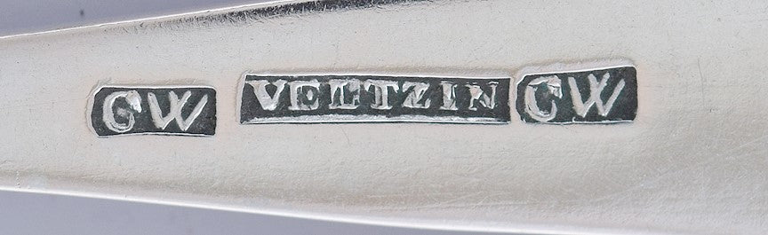 Each spoon has two stamps of CW with a stamp of VELTZIN in between, which we unfortunately cannot identify.