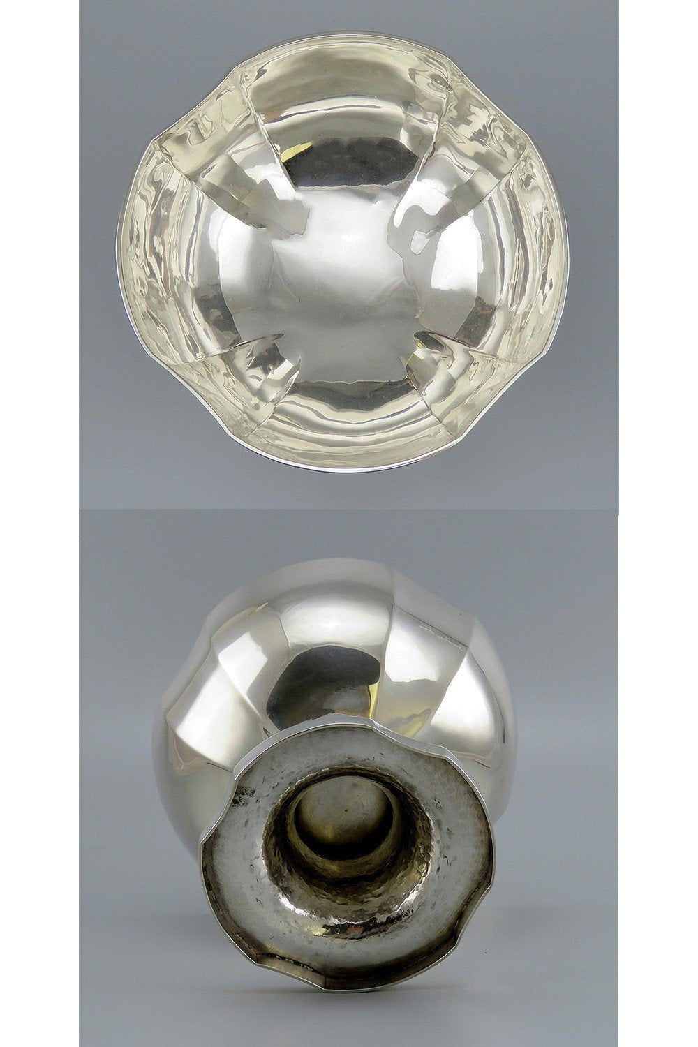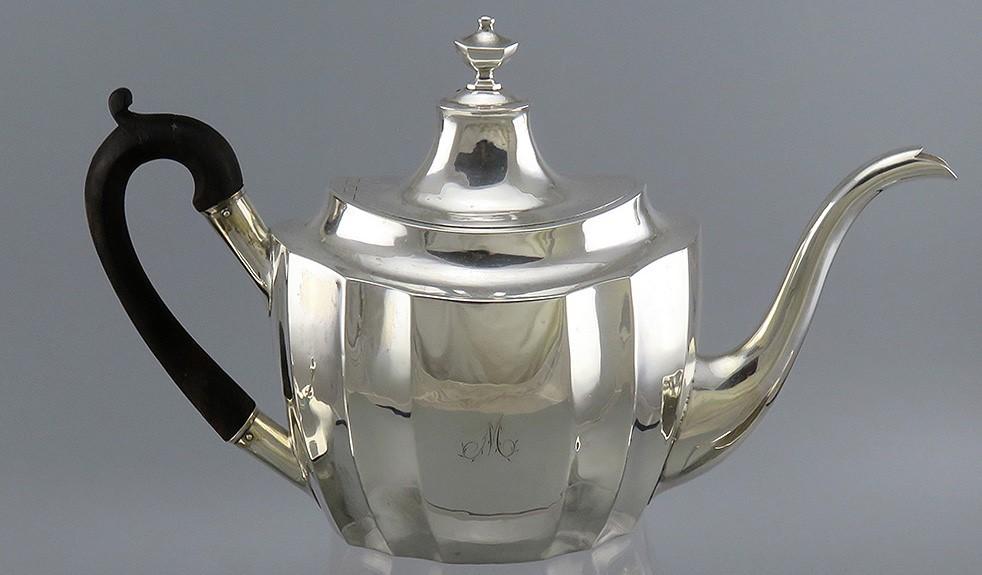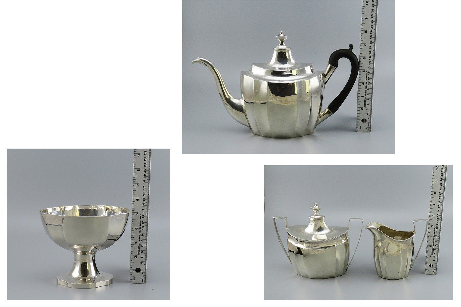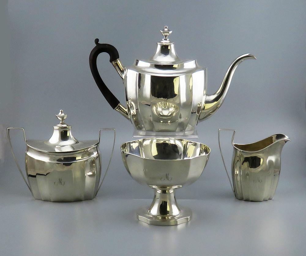 This set is in great overall condition, particularly for its age. The teapot has had a repair to its wooden handle, where it has been glued and also pinned with wood pins, near the top/thumbpiece of the handle. There is also a chip/gouge that was filled in near the base of the handle. The handle is still quite sturdy and strong, but this repair could likely be done more professionally to make it less noticeable. The teapot itself has a couple of tiny dings which are quite minor. The creamer has an old solder repair to the underside, and probably another solder repair beneath where the top of the handle joins the body, as well as a few small dings here and there. The waste bowl has a couple of dents to one 'rib.' The sugar bowl has a little bit of a bend to the finial of the lid, and a couple of minor dings here and there. No solder repairs besides the two noted, no leaks, and no monogram removals.