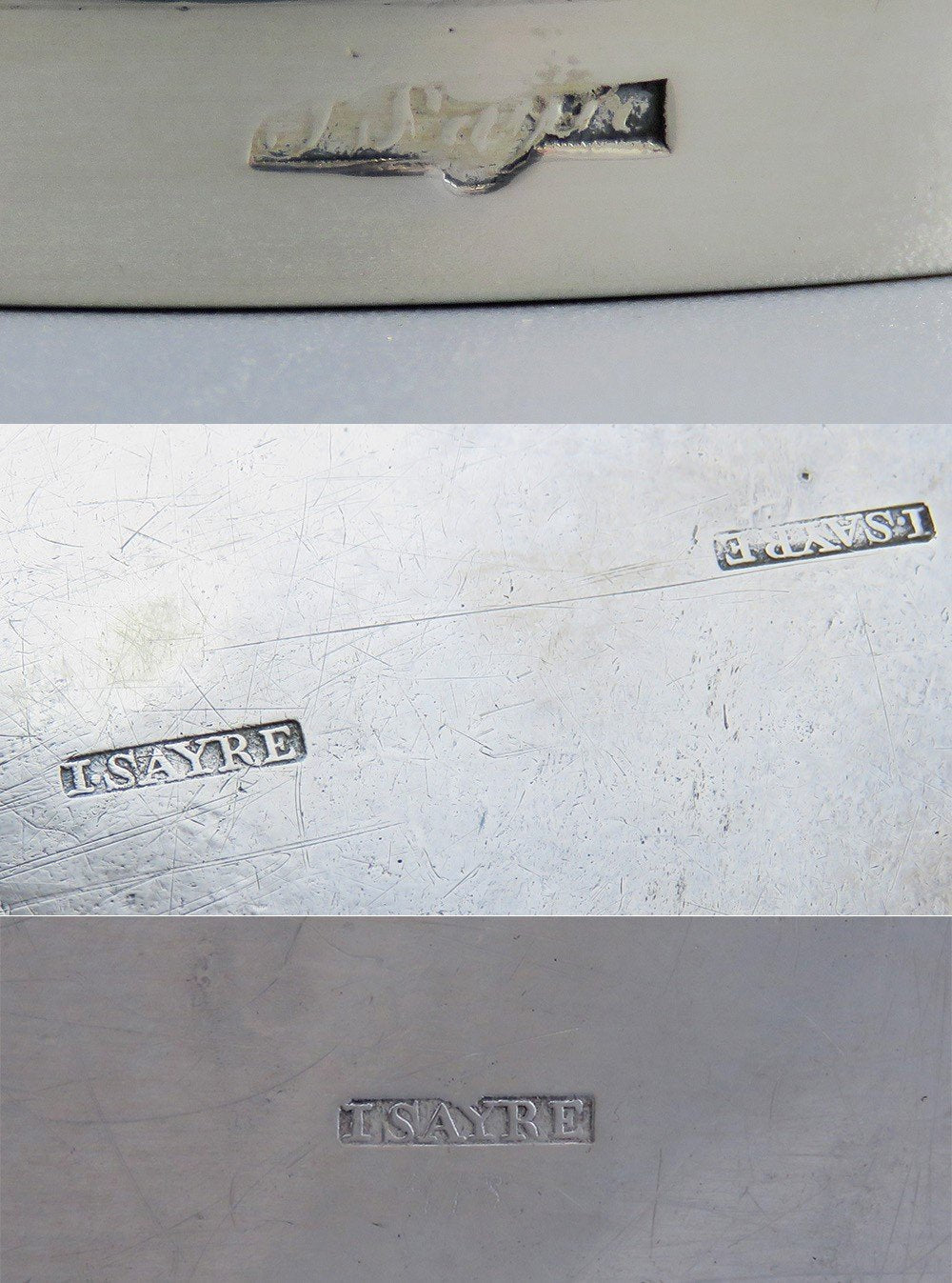 The teapot and sugar bowl are stamped on the underside with the maker's mark for John Sayre, an American silversmith working c1796-1818 in New York. The creamer and waste bowl have the mark of Joel Sayre, who worked alongside his brother John circa 1798-1811. The J. Sayre mark is generally attributed to Joel, while the I. Sayre (remembering that J is often stamped I at the time period) is generally attributed to John, but the presence of both certainly suggests the set was made in the time period both brothers worked at the same location. All the pieces are coin purity silver (900) tested and guaranteed.