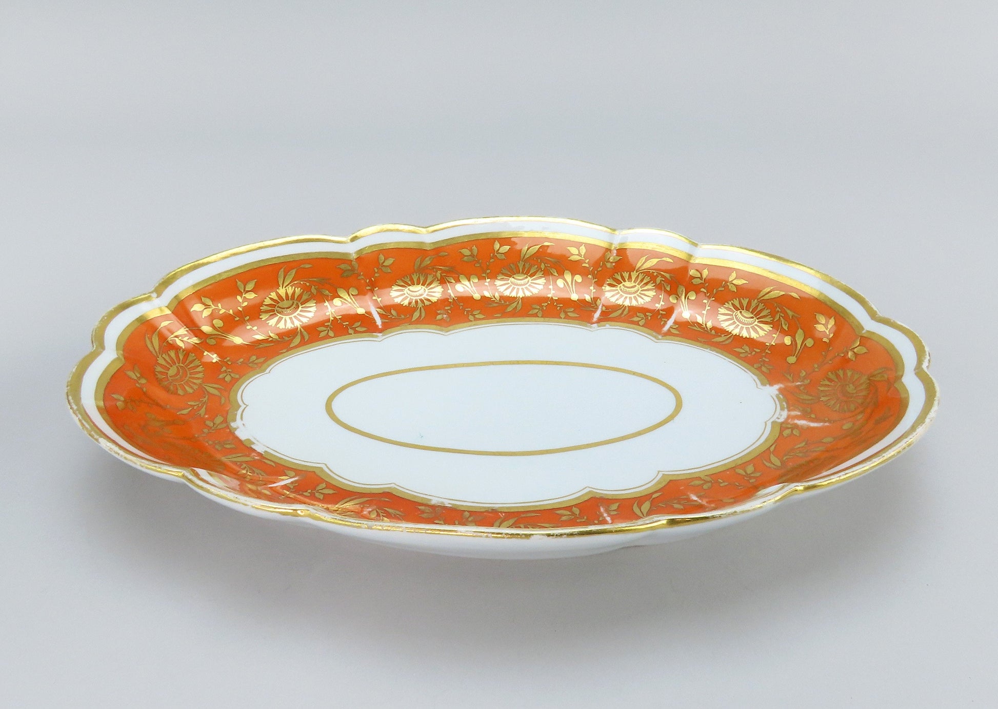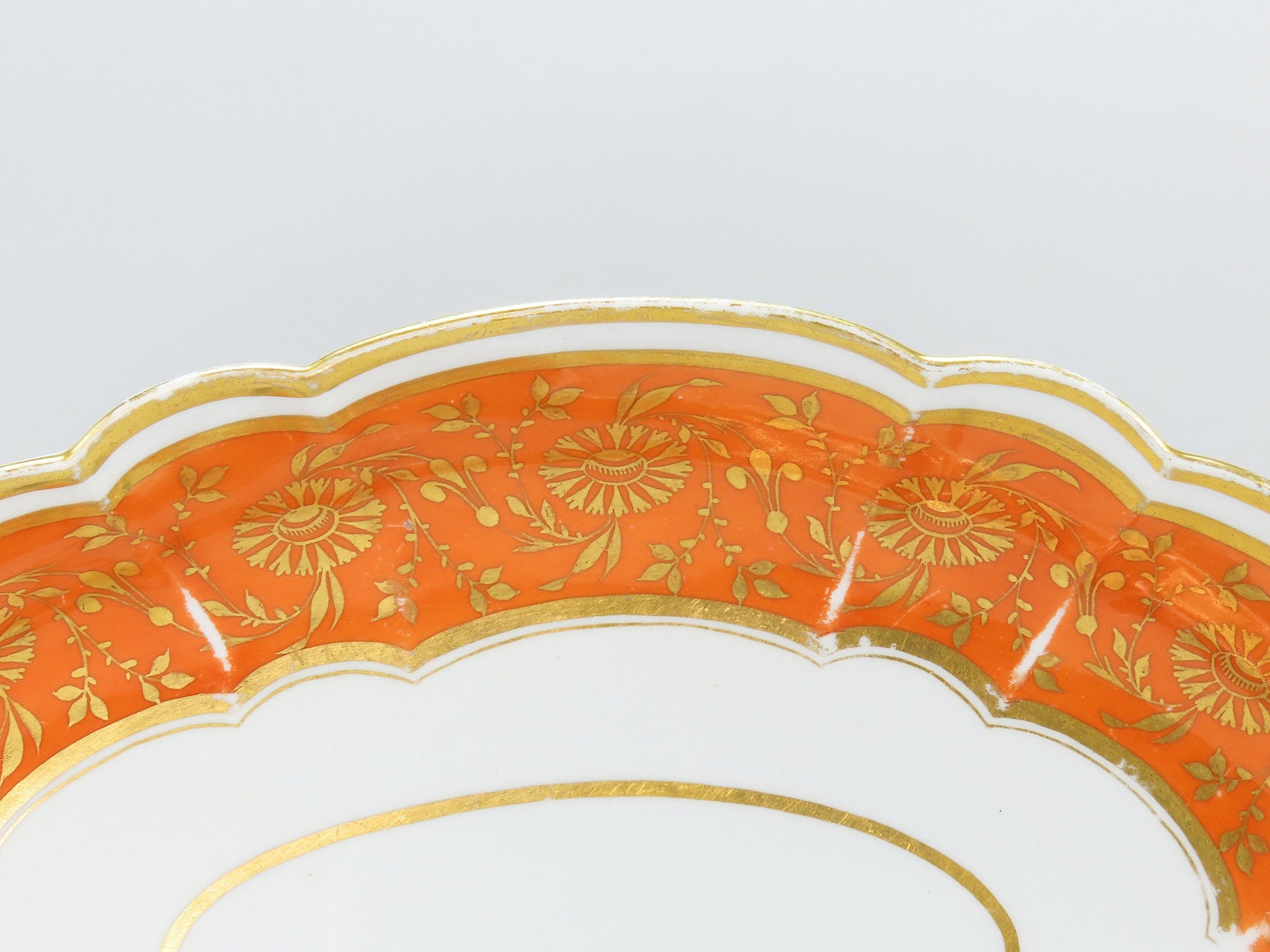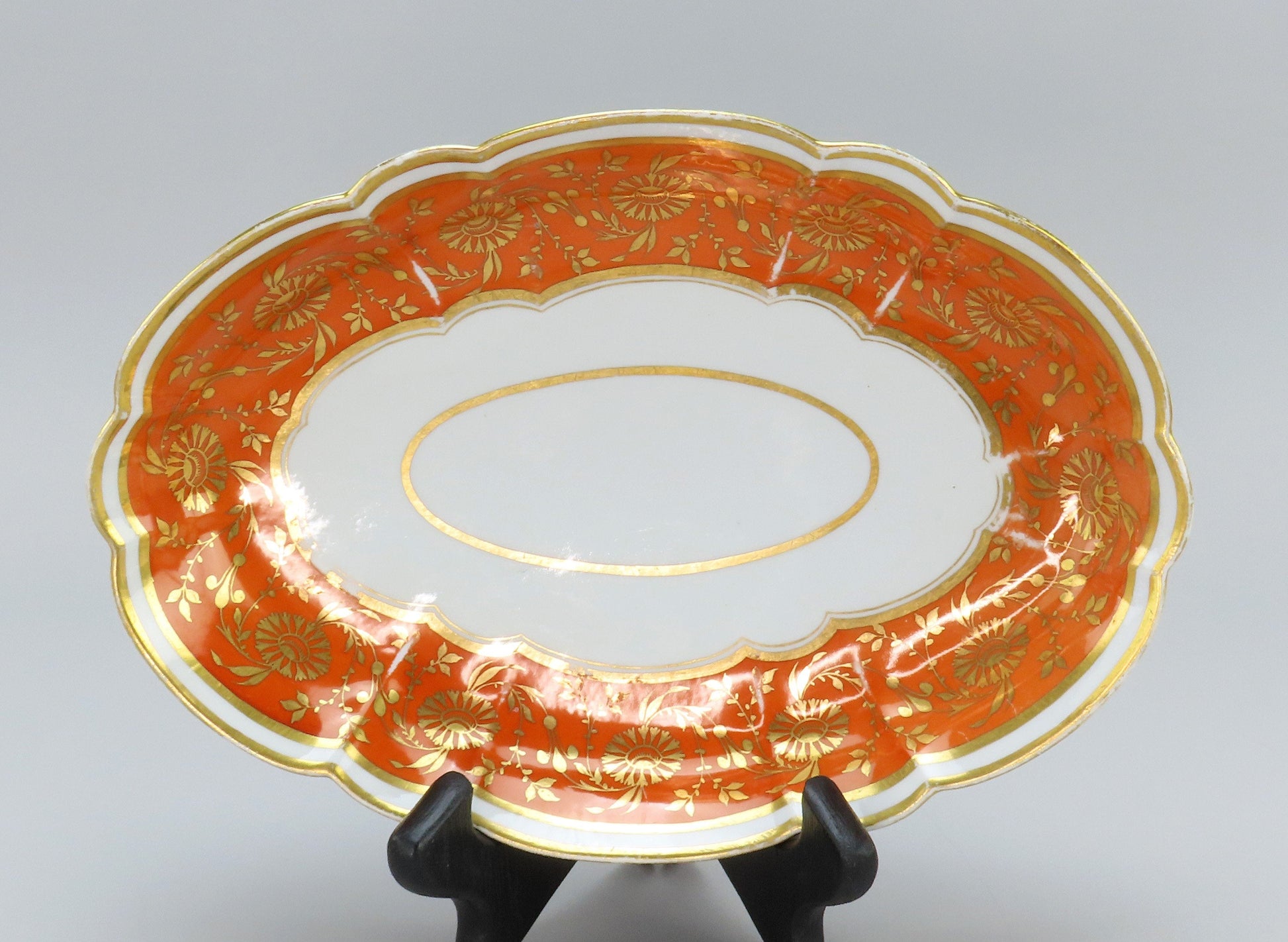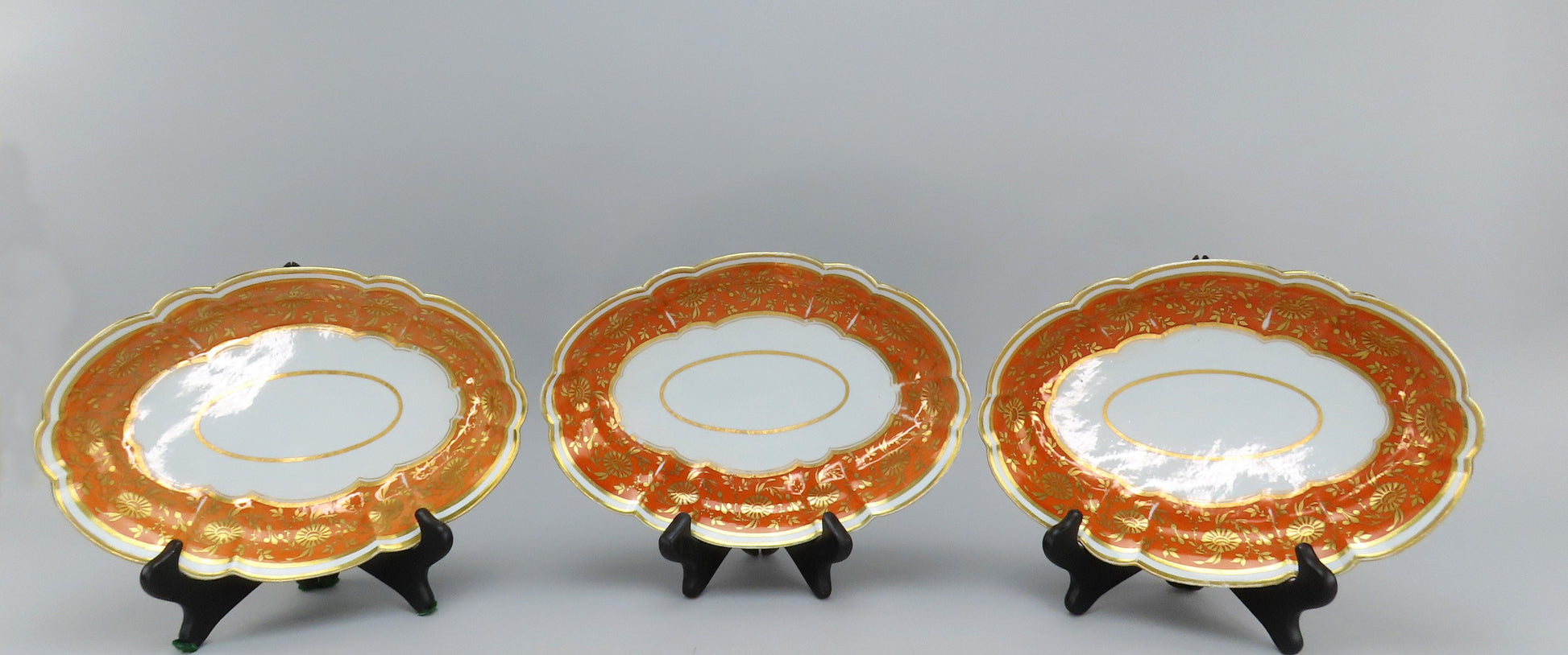Presented is a great set of 3 oval serving dishes from Barr, Flight, and Barr. This set was likely produced between 1807-1813 and displays a bright orange band with richly gilt flowers and leafy vines. The dishes have a nice soft scalloped edge and gilding along the rim.