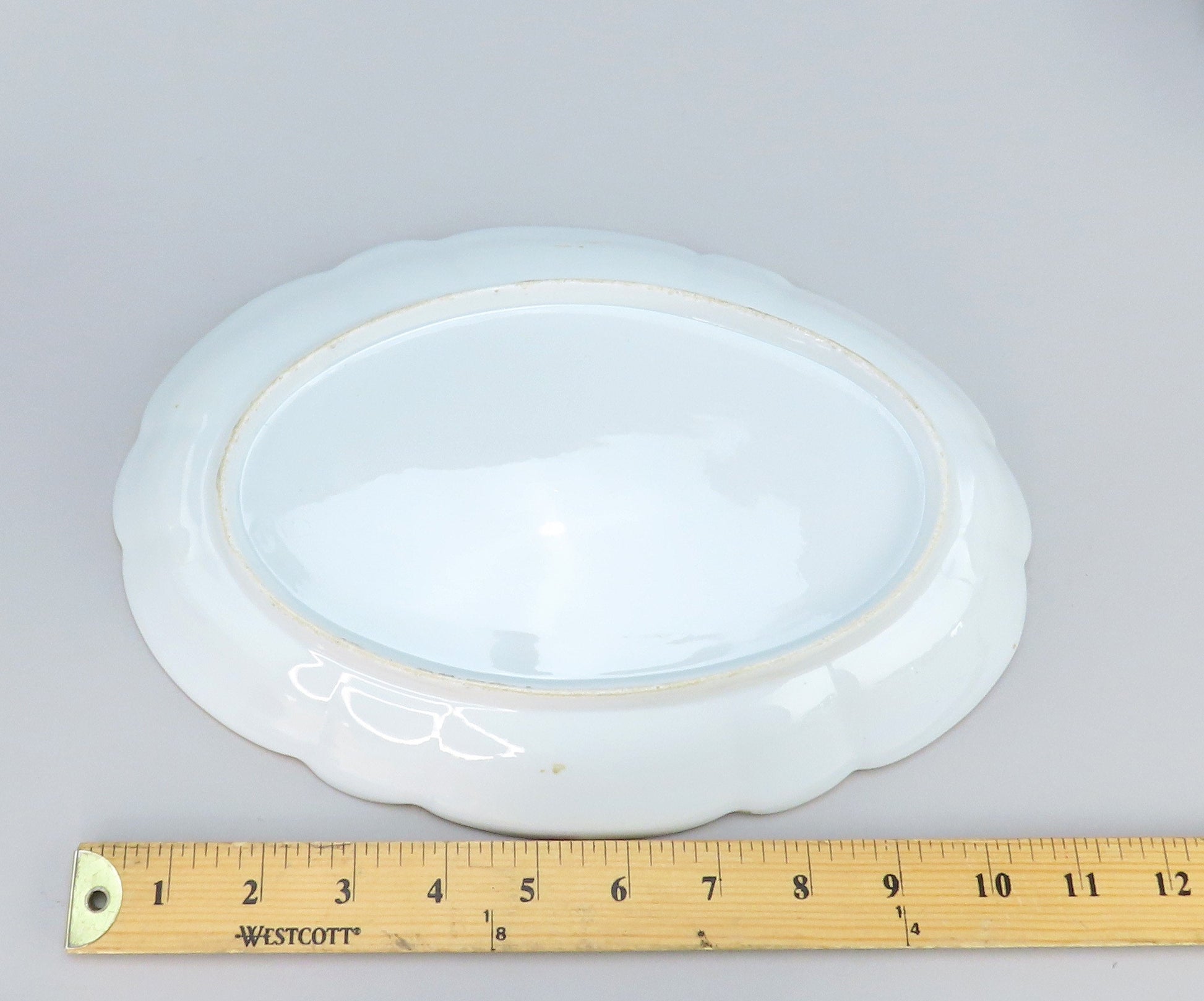 This set of oval serving dishes are in great overall condition, especially considering age. There are some losses to the paint and gilding, mostly on the edge and the ribbed high points. The ribbing has likely lost paint from the dishes being stacked on top of each other. There are no chips, no cracks, no breaks, and no repairs.