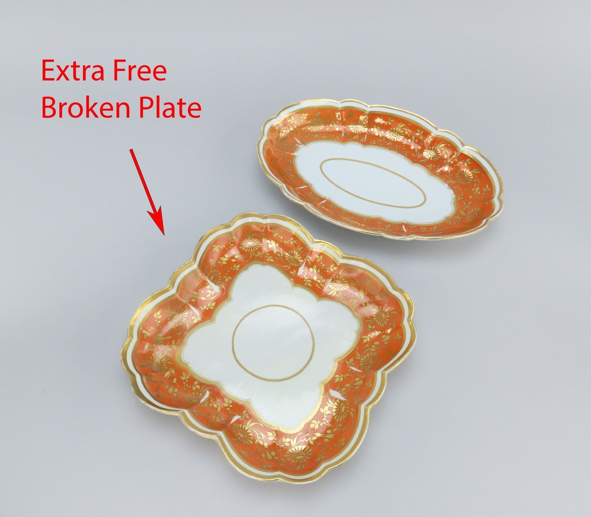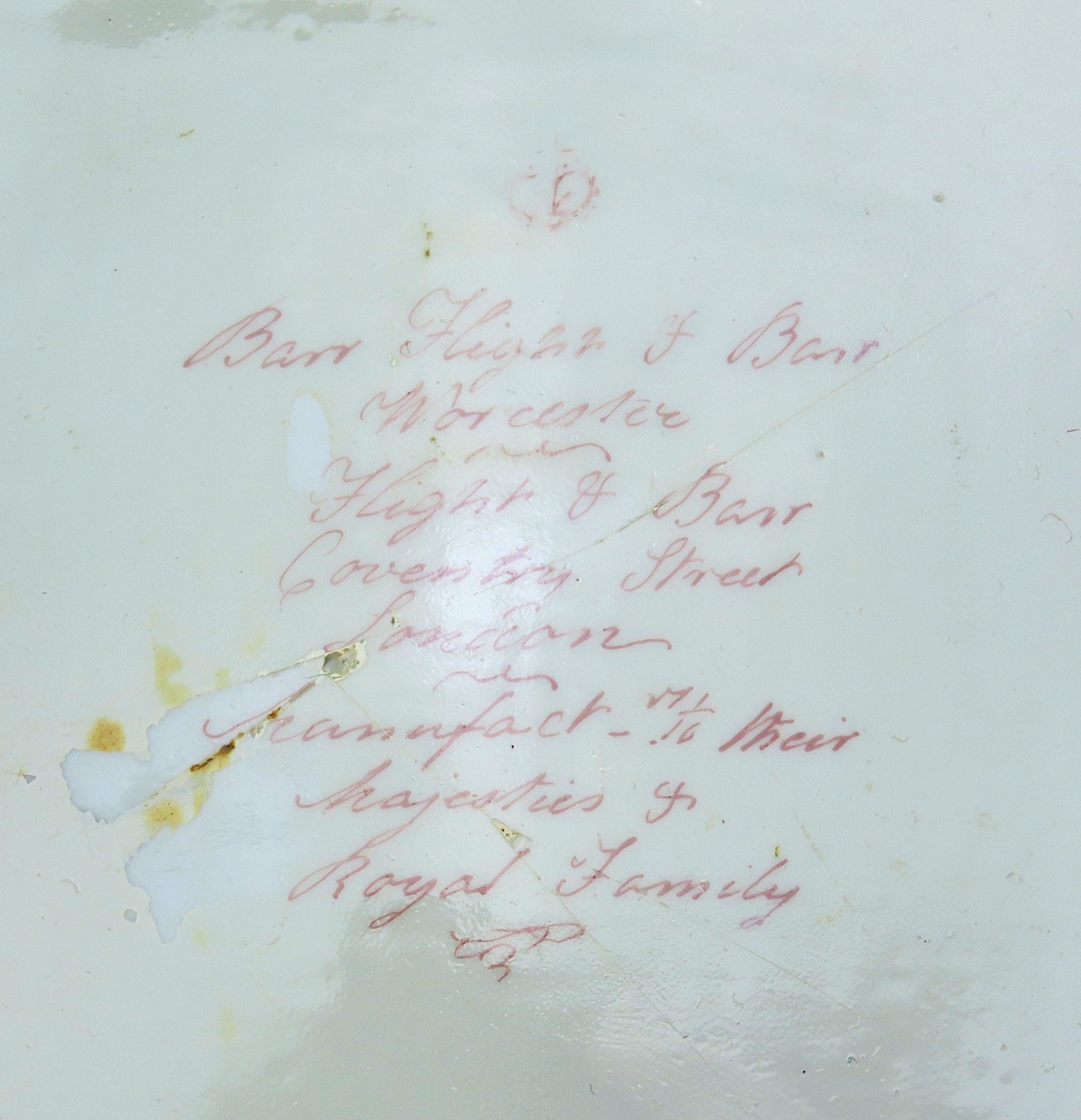 We are including with his set a free quatrefoil shaped serving dish which has been broken but professionally restored, which came to us as part of the lot. The piece, however, displays a hand-done mark from Barr, Flight, and Barr that the oval dishes do not have. The mark reads: “Barr, Flight & Barr Worcester / Flight & Barr Coventry Street, London / Manufacturers to their Majesties & Royal Family”. If you do not want this free piece, please let us know and we will not ship it to you.