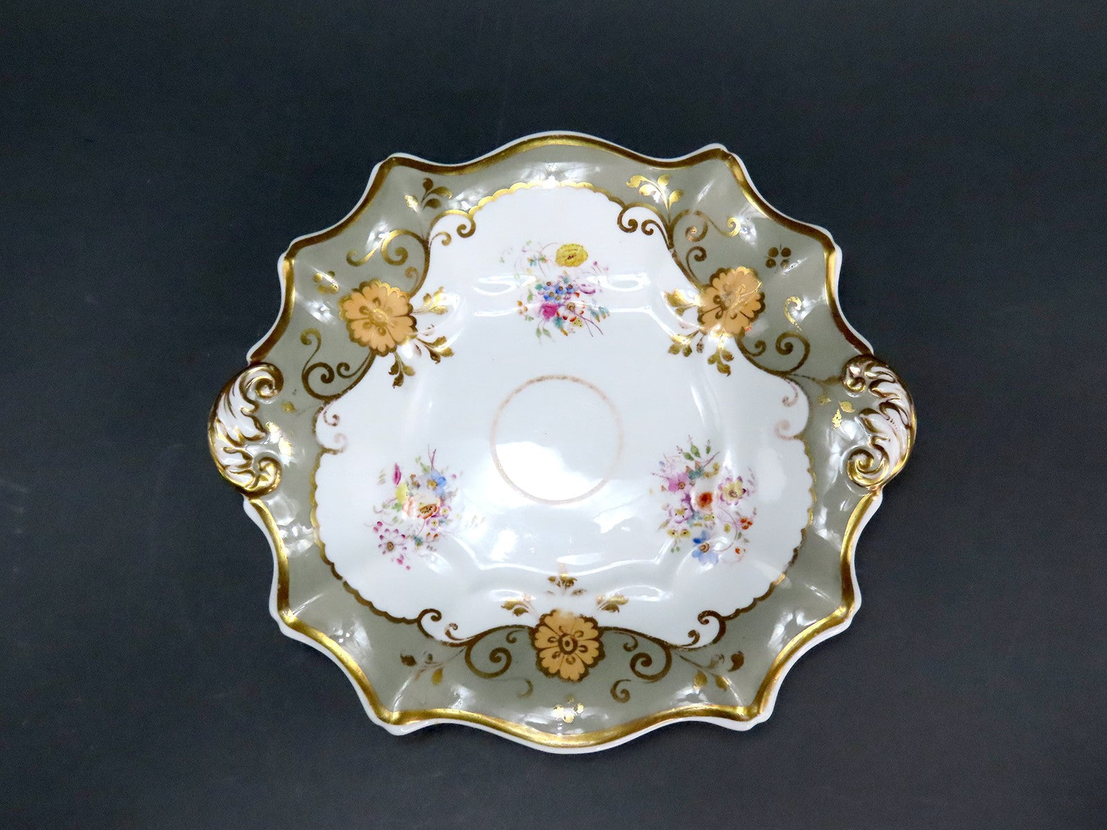 Presented is a fine English Staffordshire porcelain serving dish or small platter, likely by Davenport. This piece dates to around the 1830s-1850s. The pattern is white with sage green rims, decorated with gilt scrollwork and florettes in a peach or light orange color. Around the center are little hand painted sprays of colorful flowers, in delicate spring shades of pink, blue, yellow, purple and green, no two exactly alike.