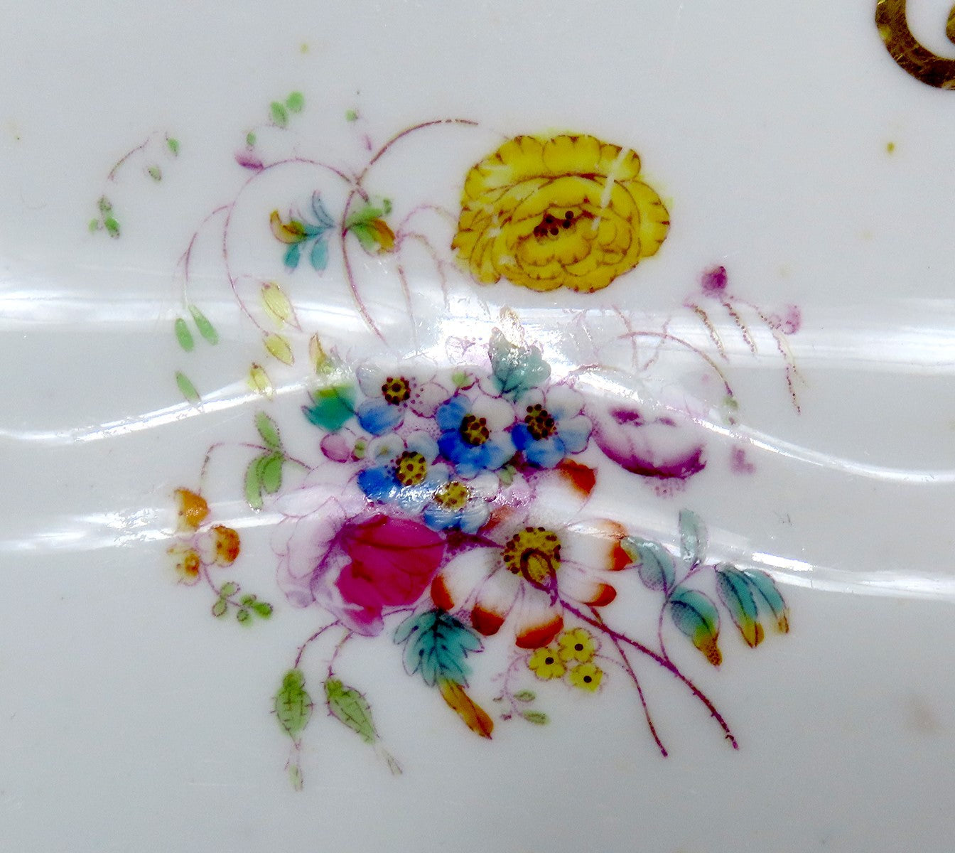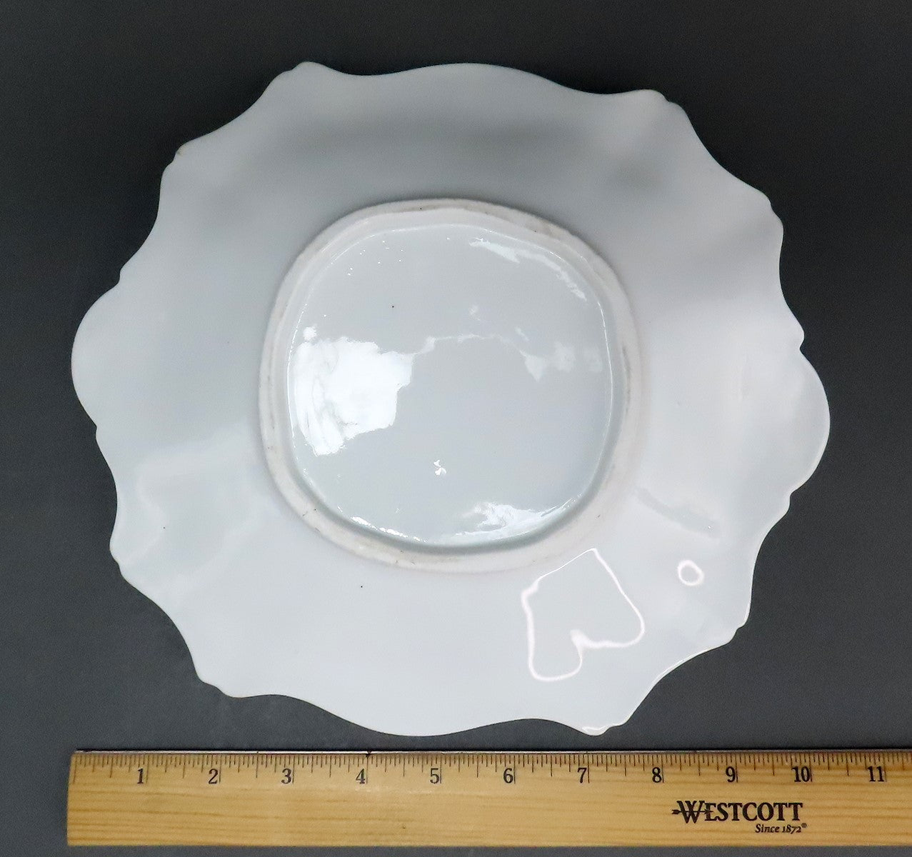 This piece is in excellent overall condition, especially considering the age and material. The dish has some minor wear to the gilding and the peach flowers. The dish rings nice and clearly when tapped. There are no chips, no cracks, no breaks, and no repairs.