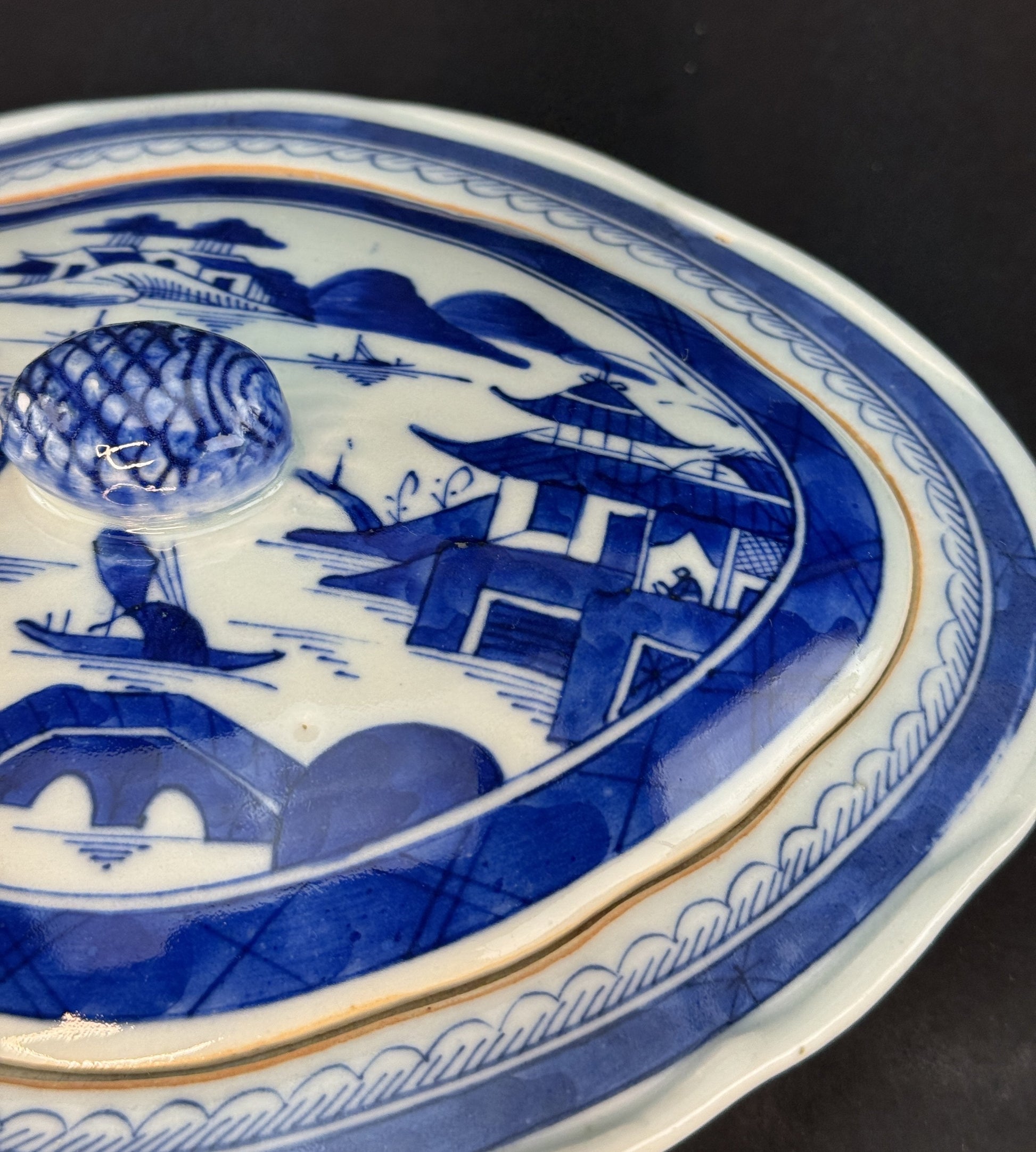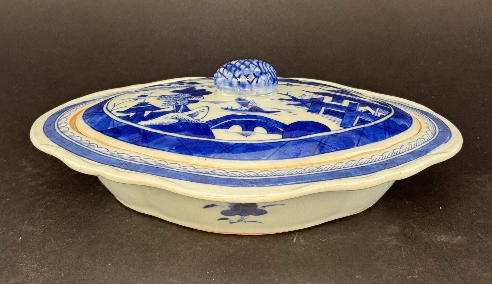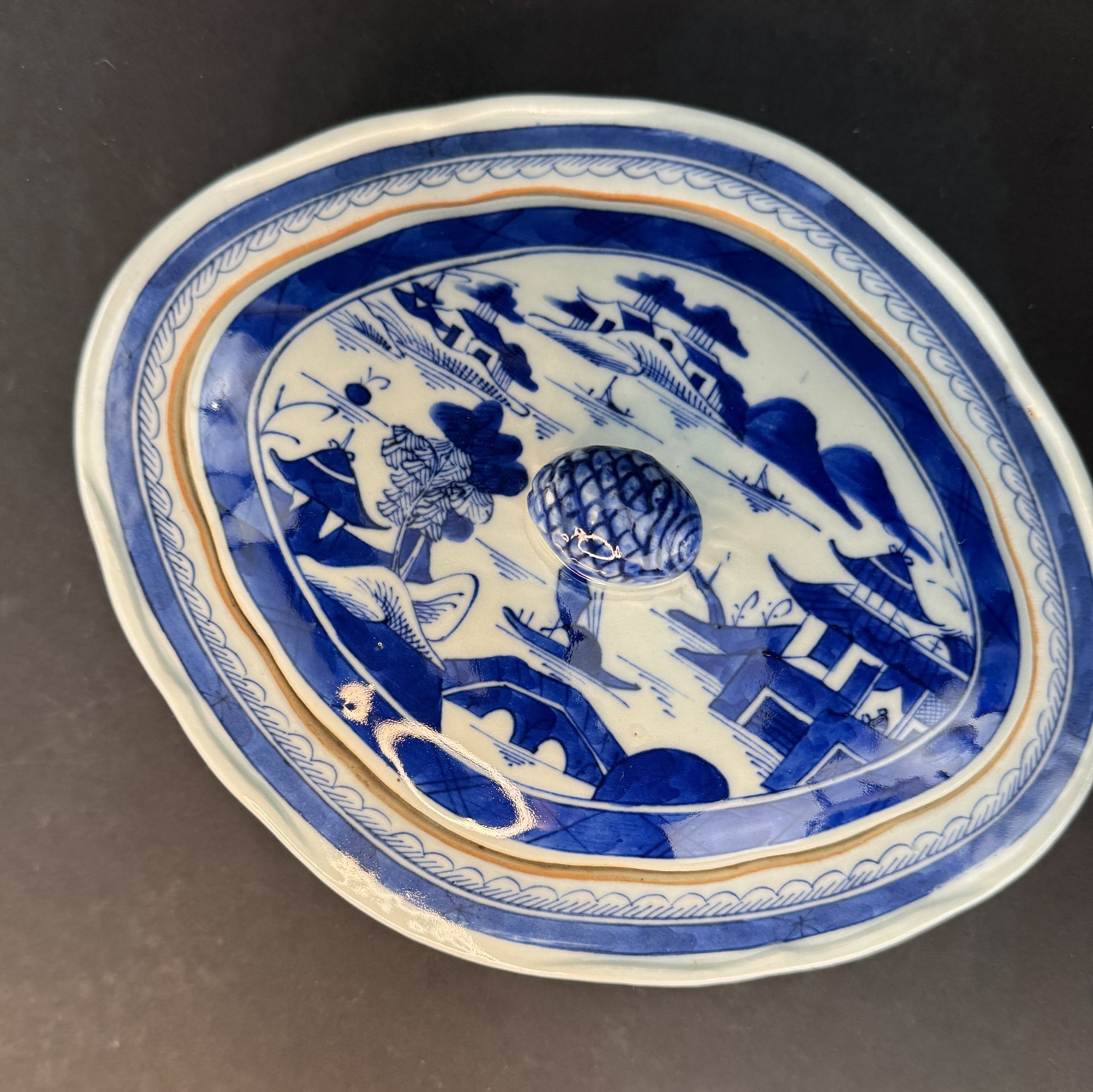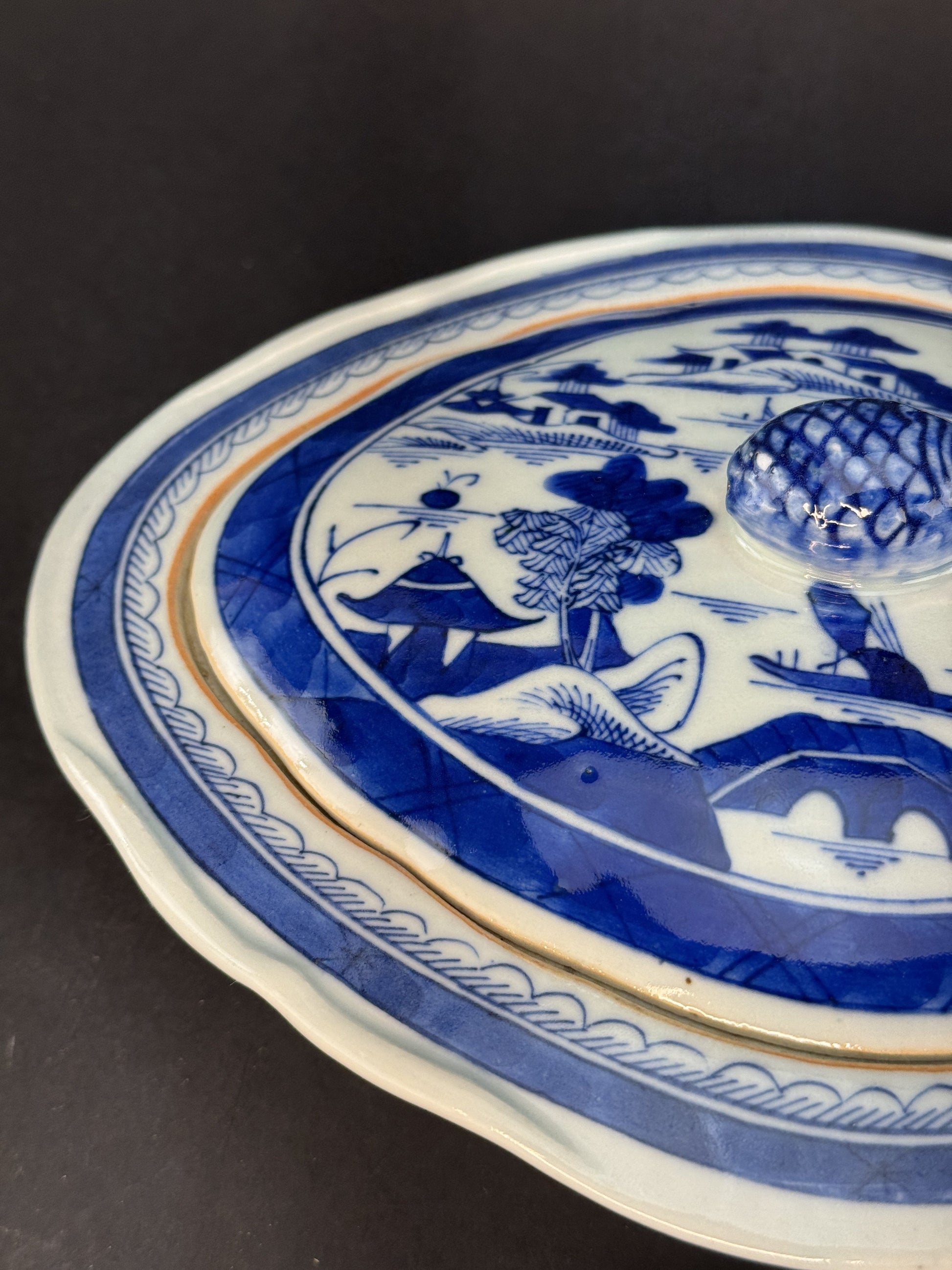 c1850-1880s Chinese Export Blue White Canton Blue Willow Covered Serving Dish