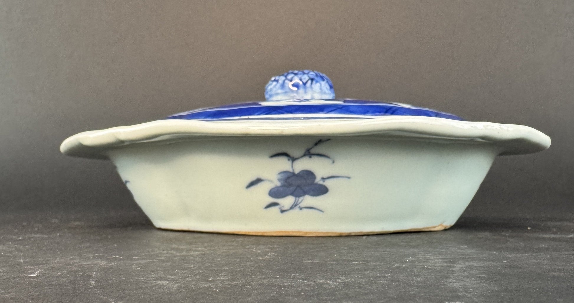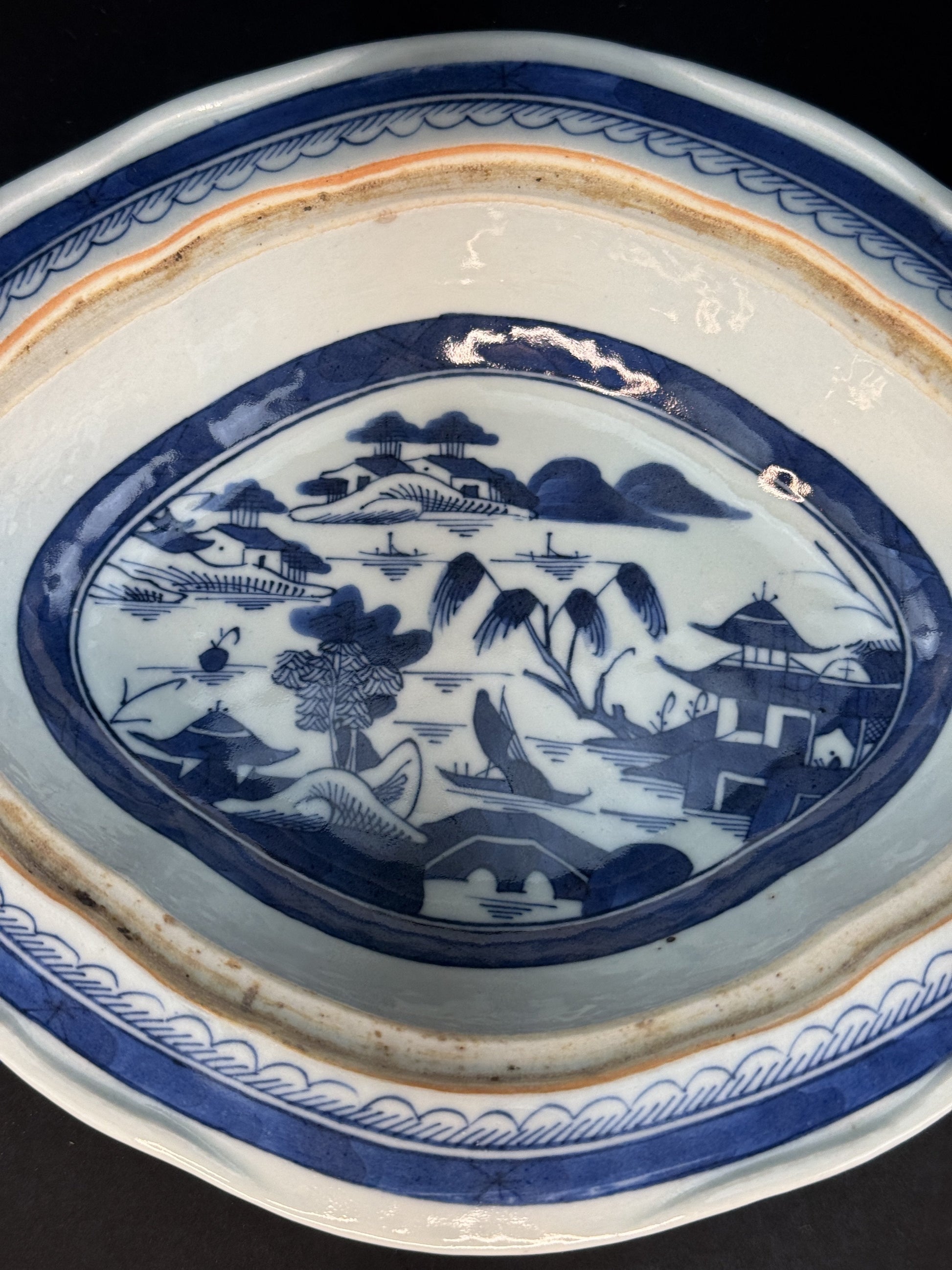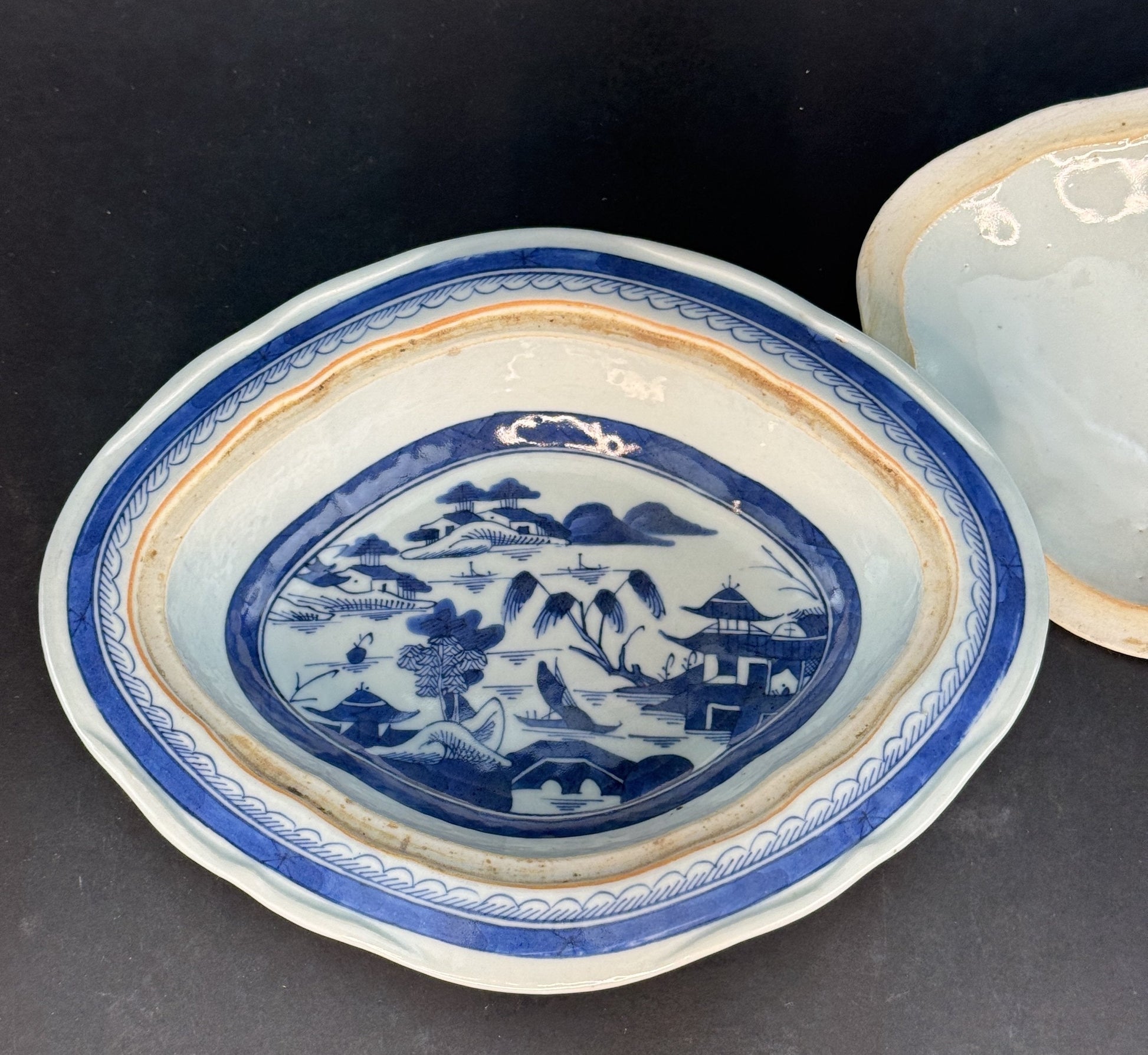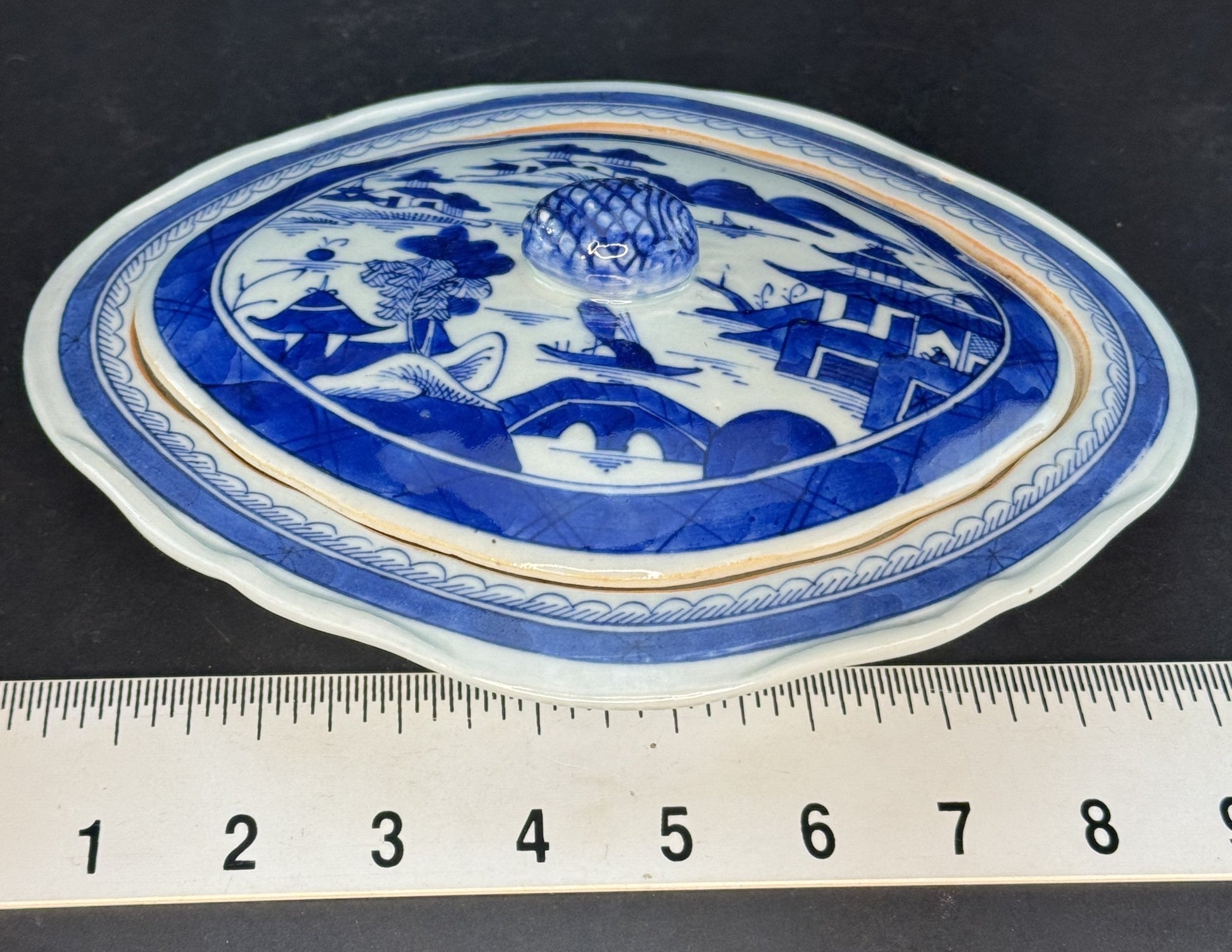 c1850-1880s Chinese Export Blue White Canton Blue Willow Covered Serving Dish