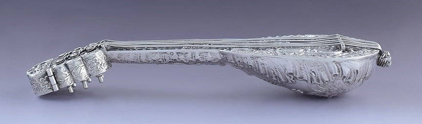 Presented is a lovely little European silver scent or perfume bottle in the shape of a lute. This piece dates to the second half of the 1800s and is likely of Hanau German make. The lute is done in a realistic and ornately decorated style, complete with silver wire 'strings.' The lute features detailed scrollwork on the front and a scene of two cherubs on the back. The neck of the lute has a little cork stopper.