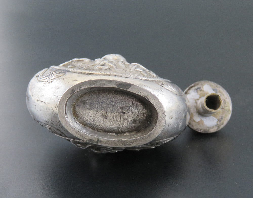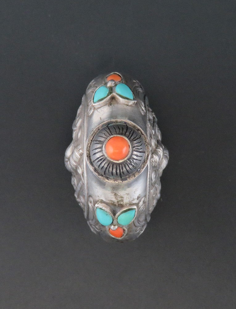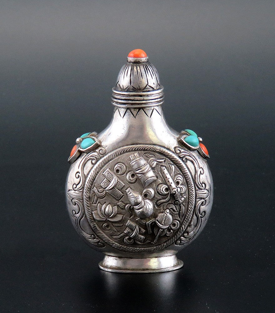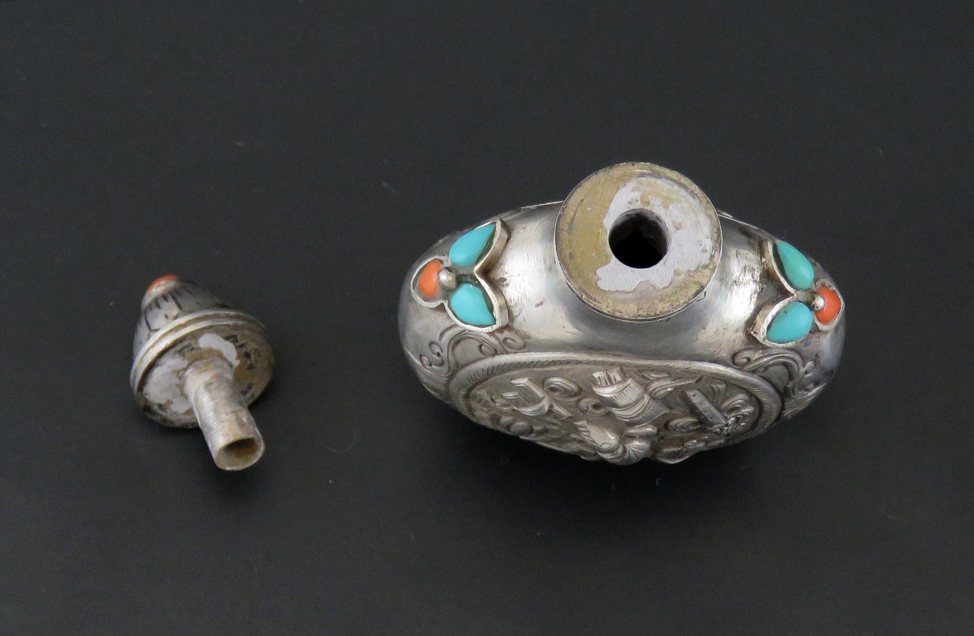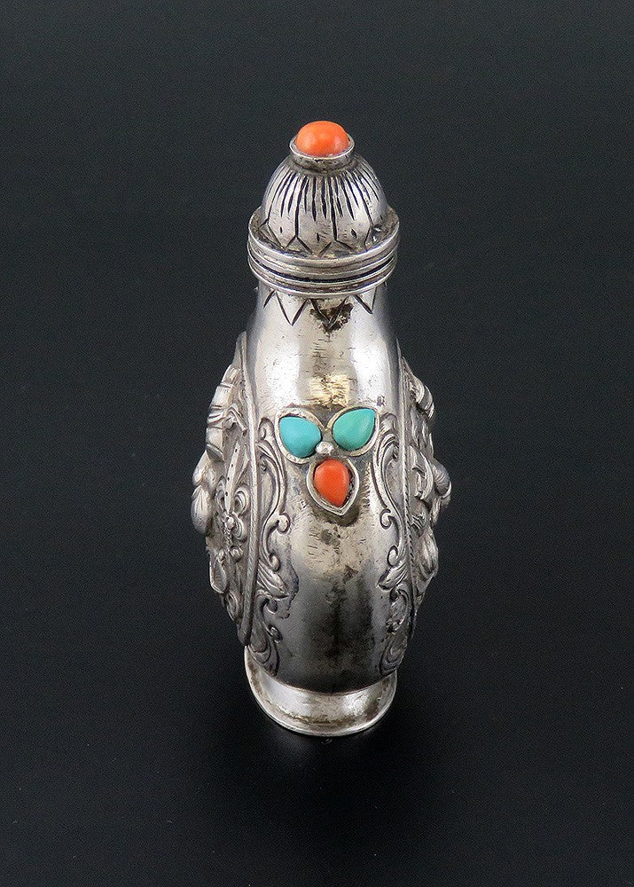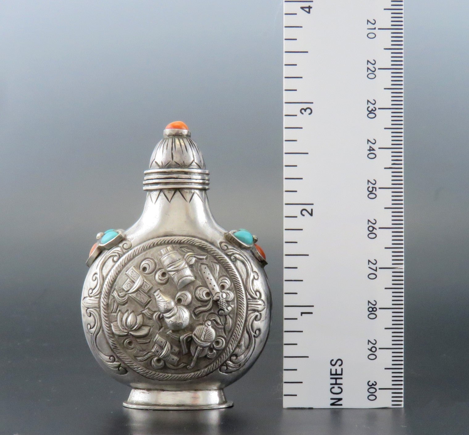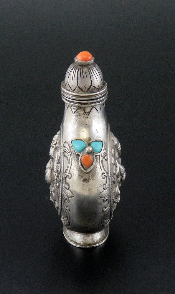 c1850 Antq Hand Chased Chinese Silver Snuff Bottle w/ Turquoise and Coral Inlay