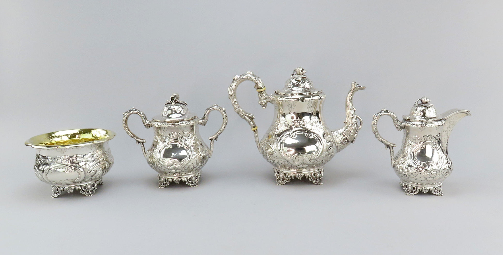 The tea set is in excellent overall condition. The chased decoration are crisp and well-defined. There are no breaks, no splits, no dents, no repairs, and no problems of any kind.