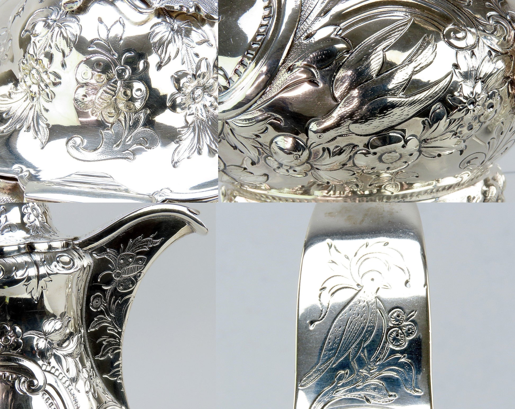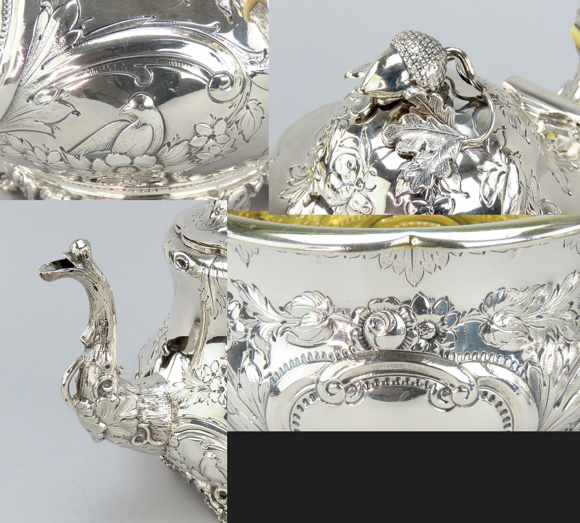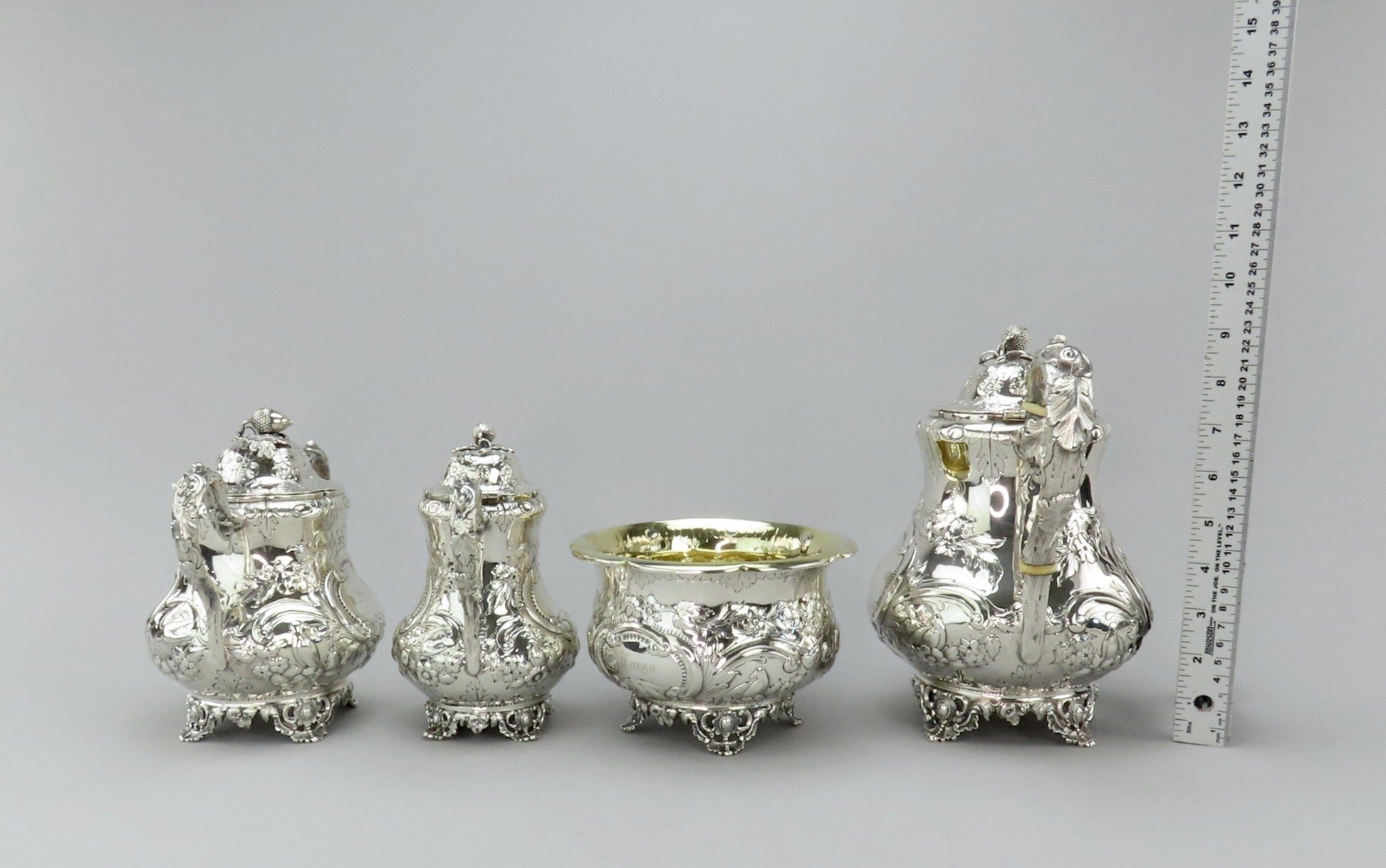 Presented is a fabulous 1850s American coin silver large 4-piece tea set. The set consists of a teapot, sugar bowl, creamer, and waste bowl. This set displays ornate hand chased flowers with birds and scrolls. All four pieces have cast and applied handles and feet which displays vines and scrolls. The quality is superb, in every way. The creamer, sugar bowl, and teapot have matching oak leaves with an acorn. The waste bowl has a bright interior gold wash.