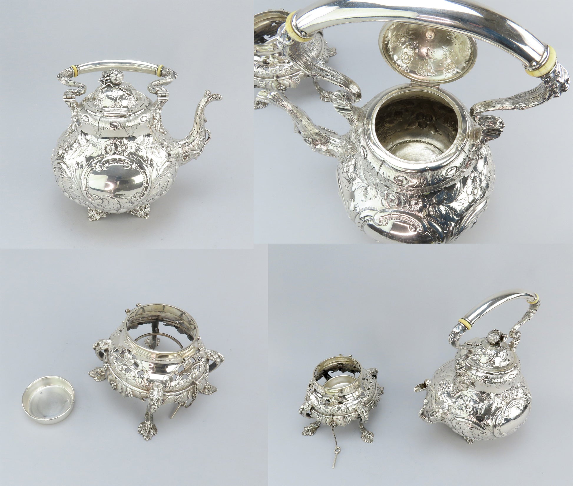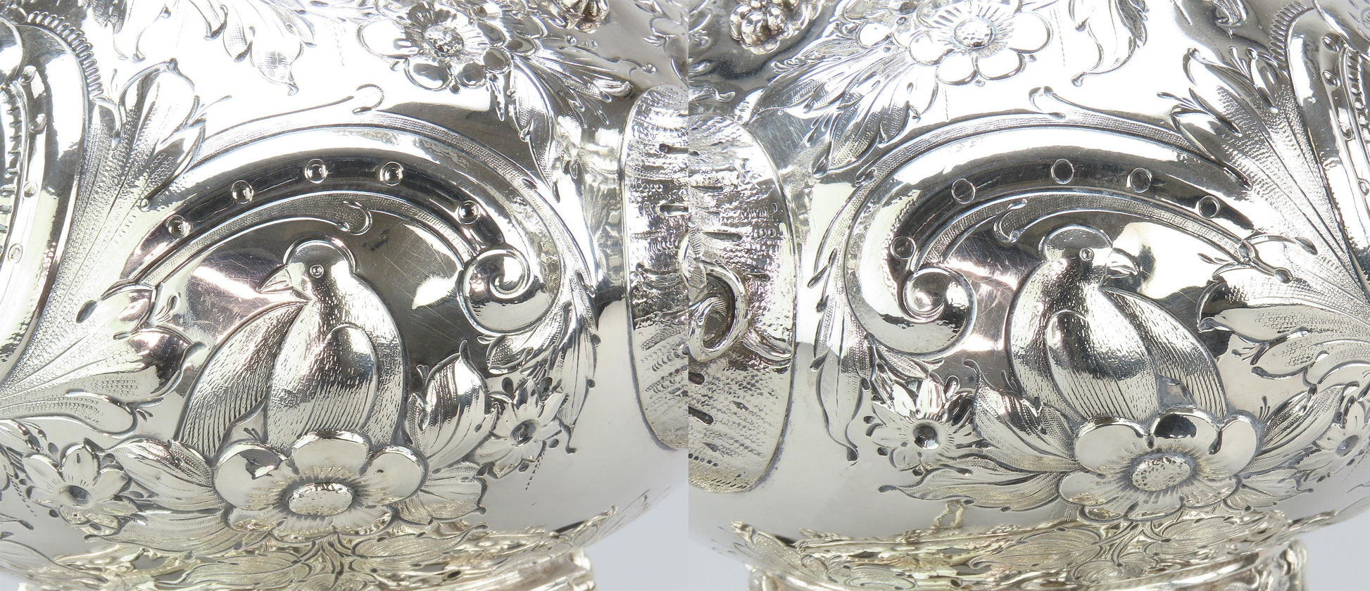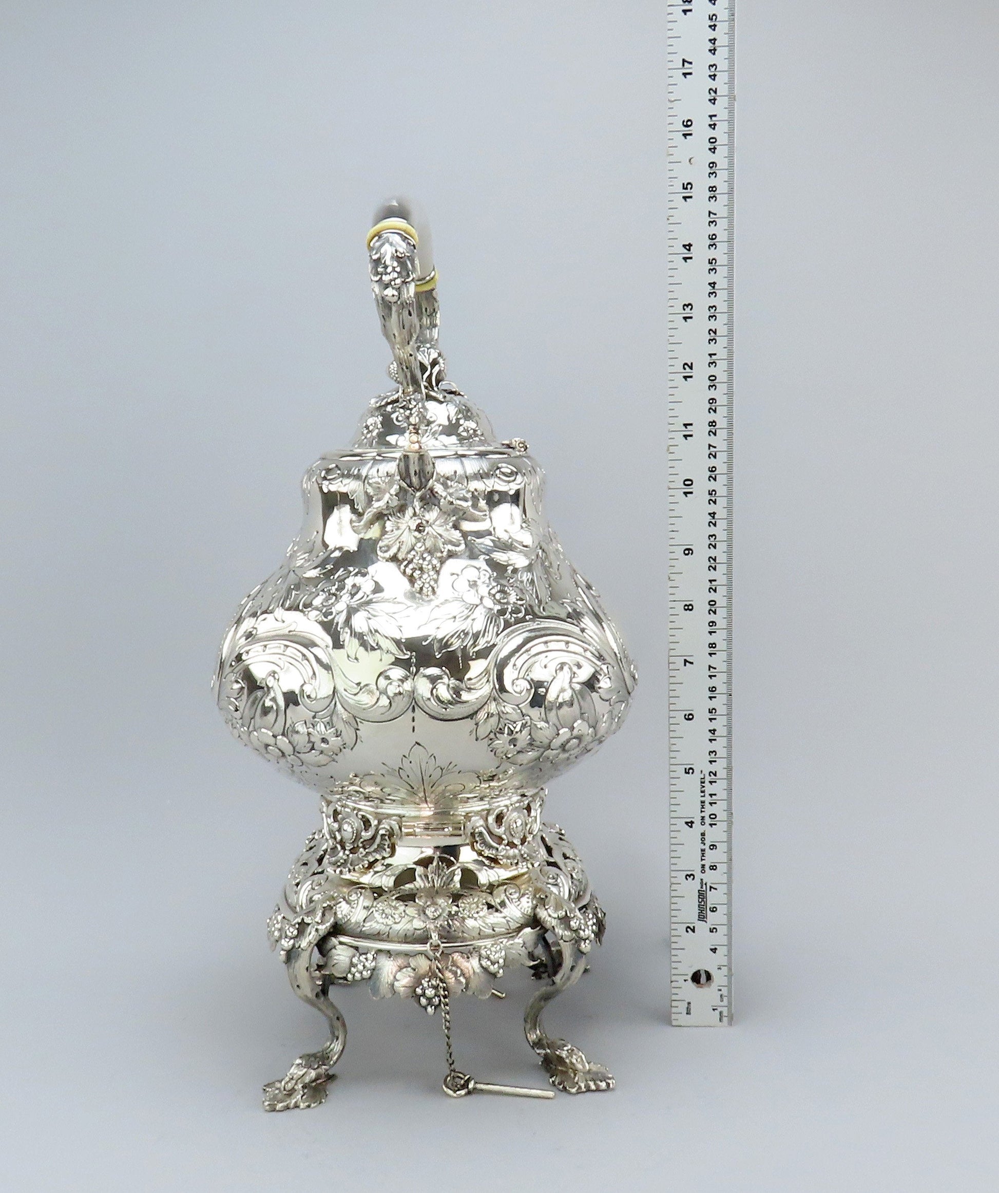 Presented is a fabulous 1850s American coin silver kettle on stand. This piece displays ornate hand chased flowers with birds and scrolls. The cast and applied swing handle, feet, and stand displays leaves, vines, and scrolls which match the engraved decorations well. A removable pin on each side secures the kettle to the stand, and also makes it easily removable. The stand does not have a burner but one could be added. The quality is superb, in every way.