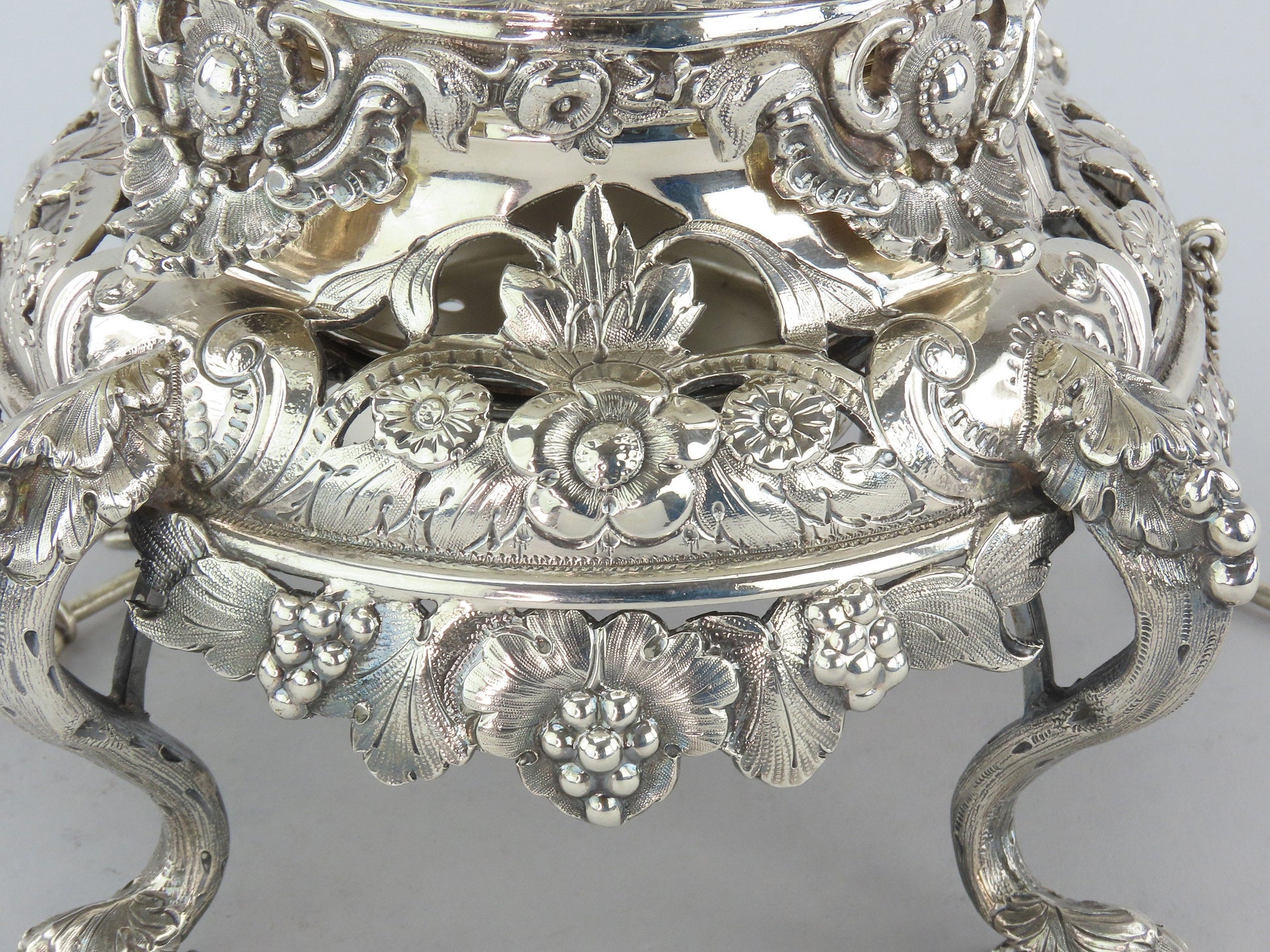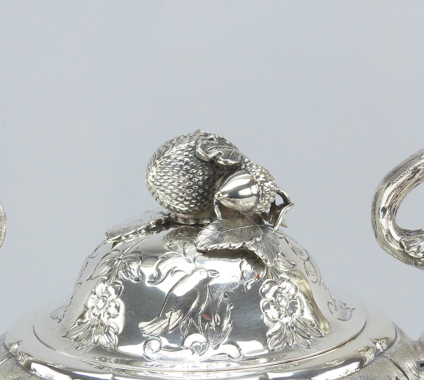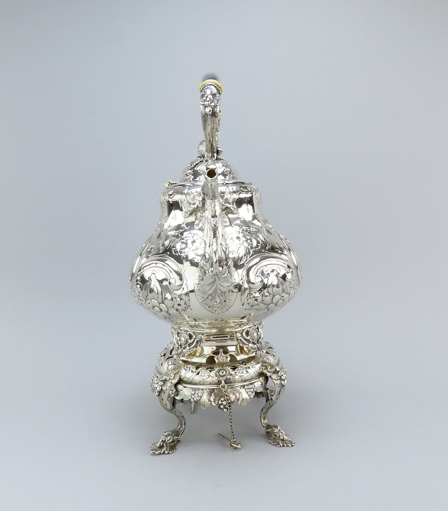 Presented is a fabulous 1850s American coin silver kettle on stand. This piece displays ornate hand chased flowers with birds and scrolls. The cast and applied swing handle, feet, and stand displays leaves, vines, and scrolls which match the engraved decorations well. A removable pin on each side secures the kettle to the stand, and also makes it easily removable. The stand does not have a burner but one could be added. The quality is superb, in every way.