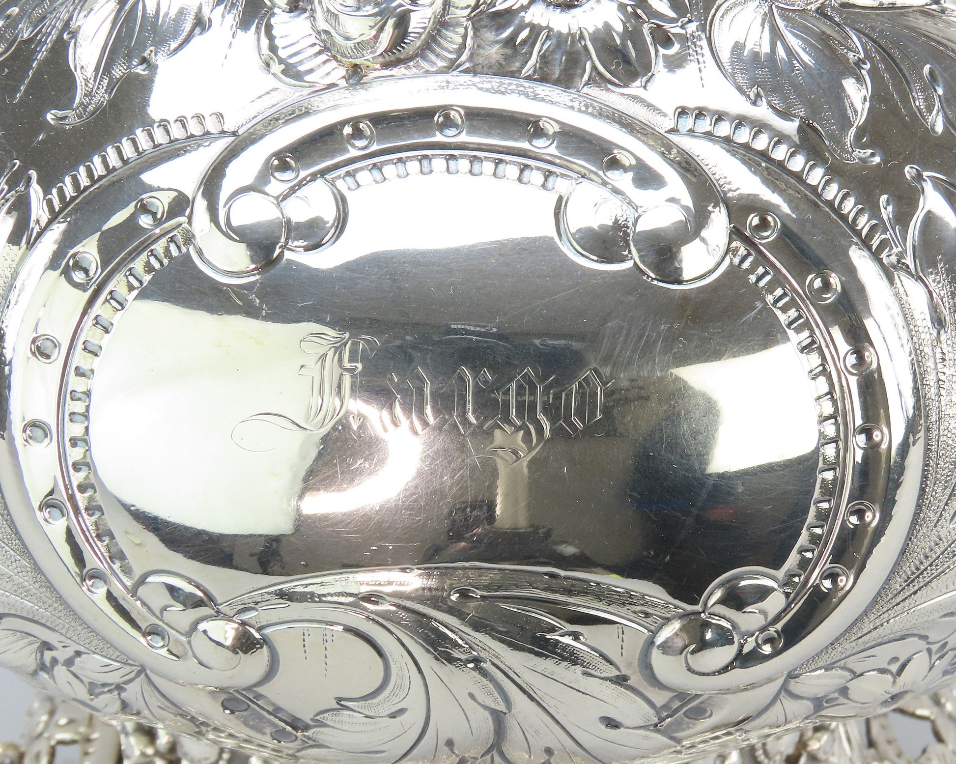 The piece is in excellent overall condition. The chased decorations are crisp and well-defined. There are no breaks, no splits, no dents, no repairs, and no problems of any kind.