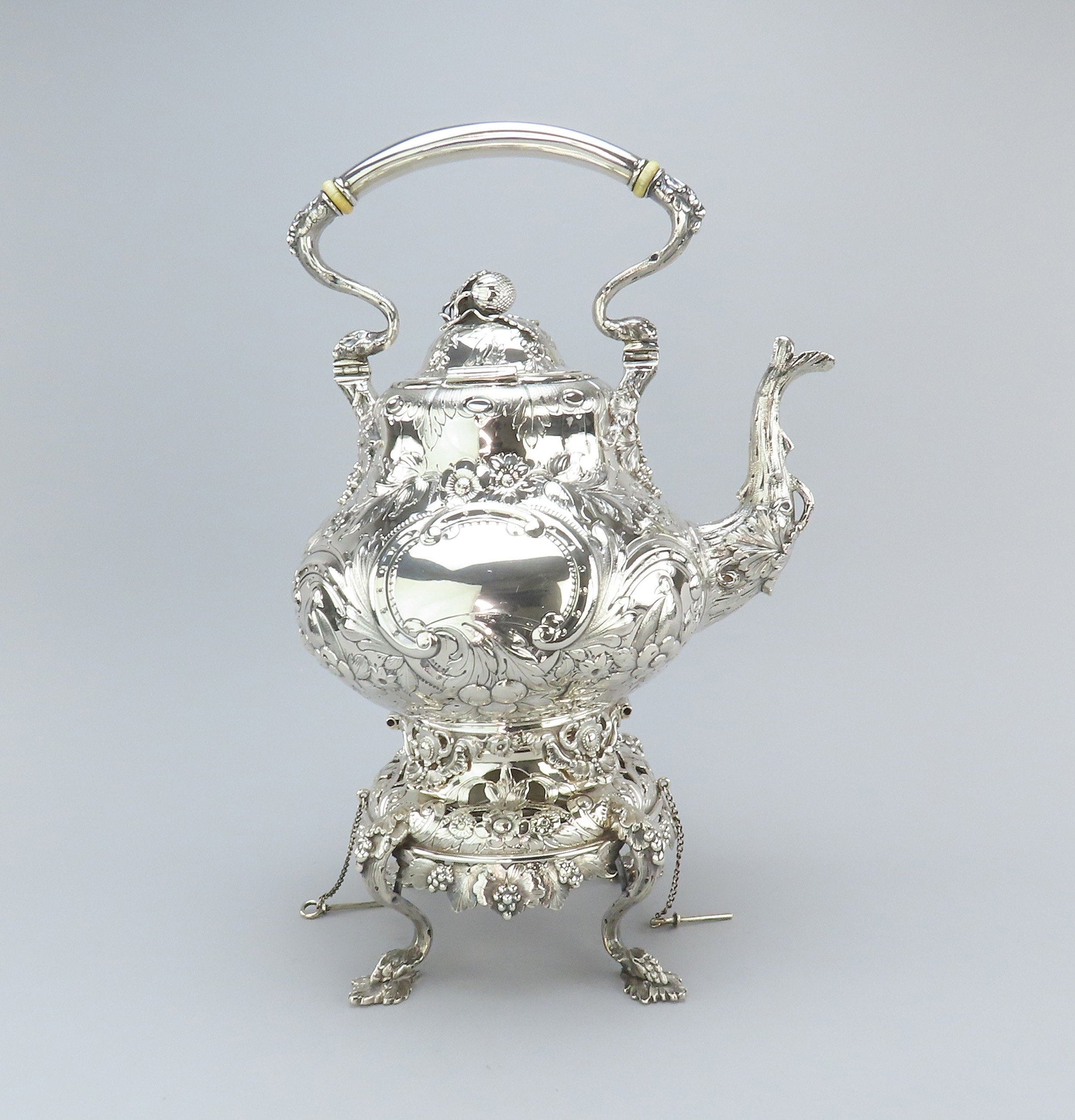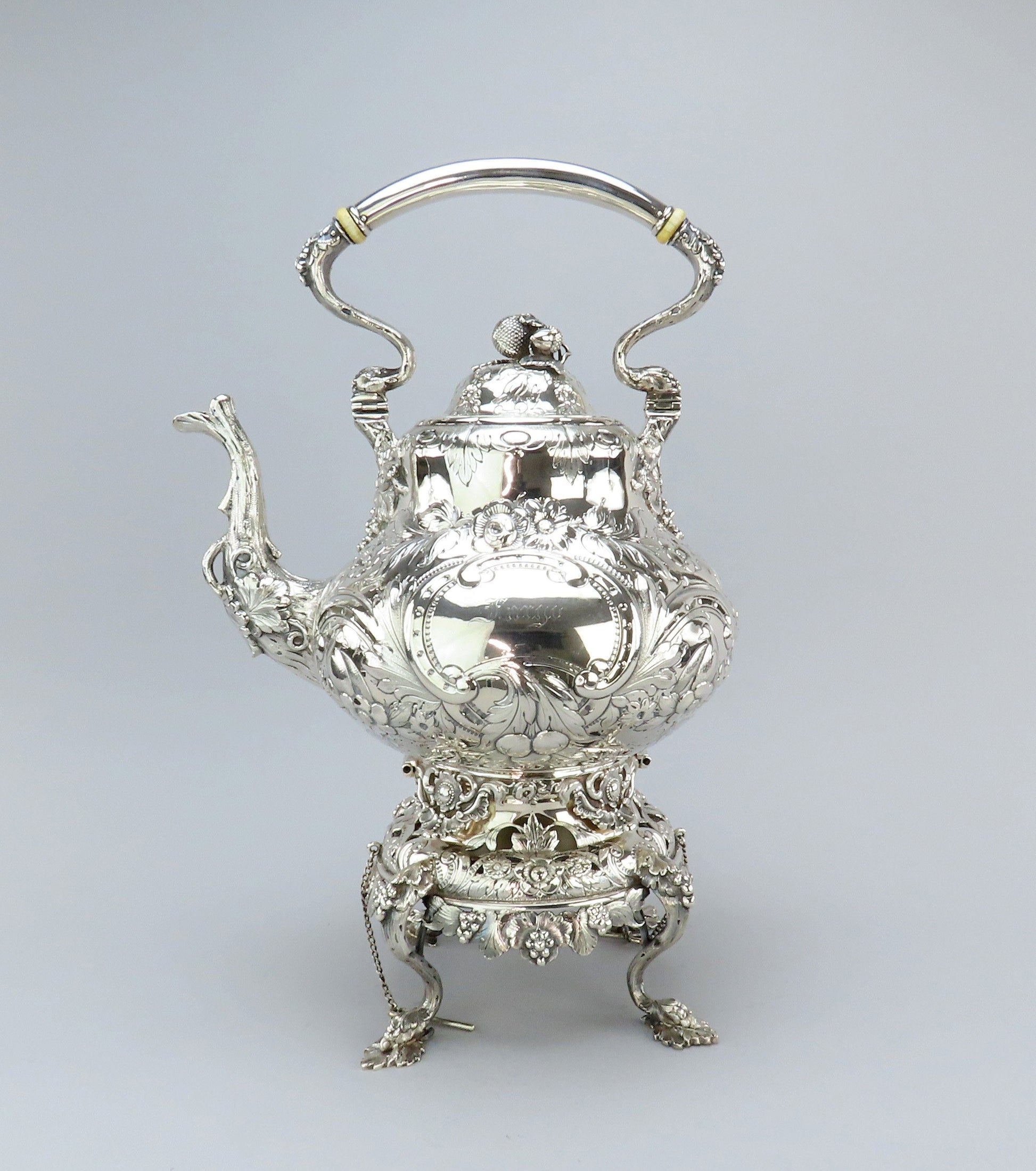 On one side of the kettle, there is a large cartouche that has been monogrammed “Fargo”. There is no doubt in our mind that it was owned by the family of William Fargo, co-founder of the freight company that became today's American Express as well as the financial institution Wells Fargo, likewise still a household name. This remarkable piece of silver came to us in a lot with several other pieces owned by this historic family, including a christening cup engraved with a presentation to Edwin M. Fargo and the date 1861. Edwin Morgan Fargo, born 1861, was one of William Fargo's eight children, though unfortunately he would die quite young, in 1865. So although the rest of the silver items in the lot are only engraved with the surname, we are quite confident of their provenance with the historic Fargo family. You can view the listings for these items, which are all extraordinary pieces of silver in their own right as would be expected from the attachment to such a prominent name, by searching “Fargo” in our store.