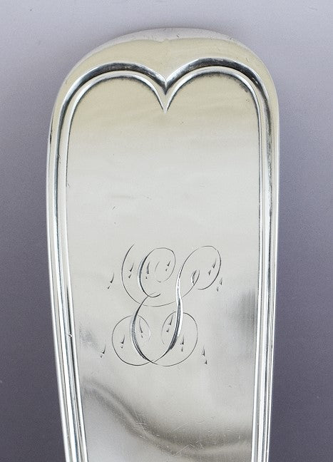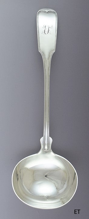 Presented is a charming American coin silver serving ladle. This piece was made by George Sharp and dates to 1852-1866. The ladle is done in a classic Fiddle Thread pattern, with the fiddlehead-shaped handle and distinctive shoulders above the bowl. The terminal of the handle is monogrammed with ES in elegant script.