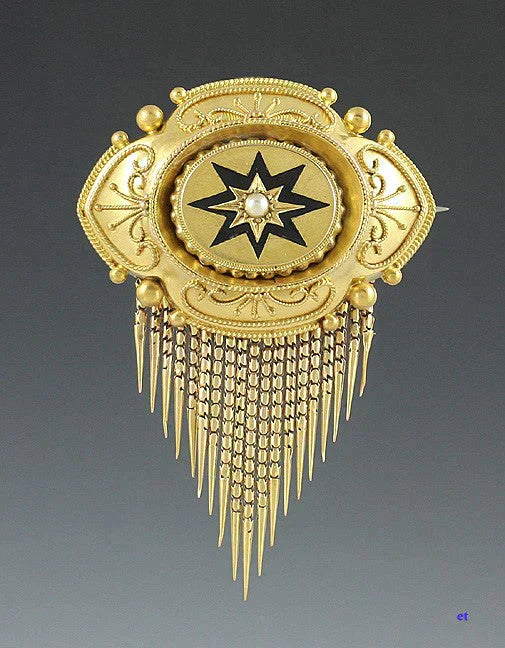 Presented is a fabulous, Victorian 14 karat yellow gold brooch or pin made during the mid to late 1800s. This piece is American or Italian in origin. The top has a bale or loop for hanging the piece as a pendant. This piece is classical Etruscan Revival style, and certainly dates from the 1850s thru the 1870s. The back of the locket has a glass covered panel that has a lock of weaved hair as part of a memorial, which was typical during the 18th and 19th century. The body of the brooch has wonderful granulated/twisted wire decorations and the center is set with a natural pearl that is surrounded by a nice enameled star design. Hanging from the pin are finely linked gold tassels. Everything is original, except the pin back and perhaps the clasp, which have been replaced.