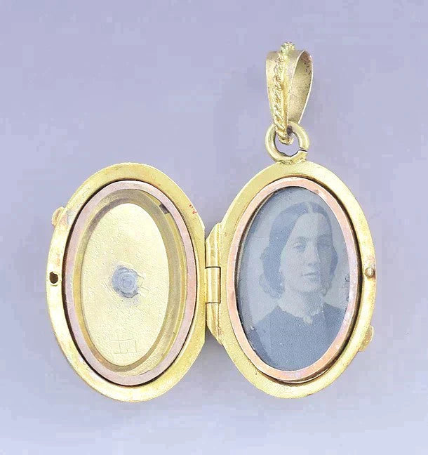 Presented is a charming Victorian 18 karat gold photo locket pendant. This piece dates to around the 1860s-1870s and is of American make. The locket is done in a classical oval form, with an applied design on the front, set with tiny natural seed pearls. The locket is done in attractively contrasting bright finish rose gold and matte finish yellow gold. The inside of the locket has an old tintype photograph of a young woman. The other half of the locket has nothing behind the glass of its bezel.