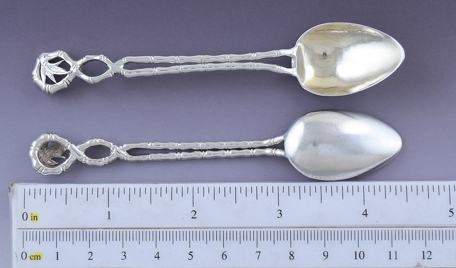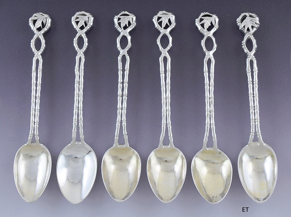 Presented is a great set of 6 Chinese export silver coffee or 5 o'clock spoons. These spoons date to around 1880-1900 and were made by Wang Hing, one of the most if not THE most renowned names in Chinese export silver. The spoons are done in a bamboo design, with a double shaft that terminates in a twist design with bamboo leaves in the center. The spoons have a faint gold wash in the bowls, some more so than others.