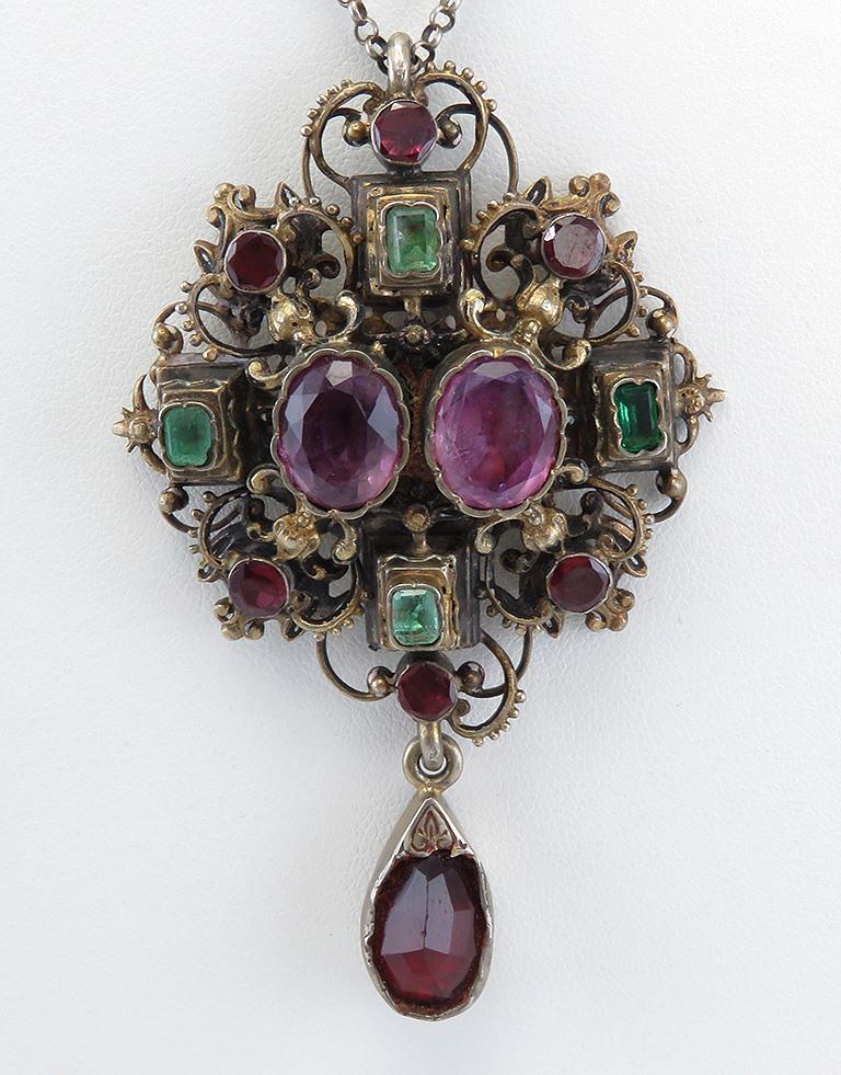 Presented is an impressive antique Austro-Hungarian gemstone set pendant, with chain. This piece dates to around 1860-1900. The pendant is gilt silver, made in a beautiful openwork design of filigree scrolls, with floral decoration hand engraved on the back. On the front the pendant is bezel set with a variety of colorful gemstones. The largest two in the center are oval cut amethysts. Set at the four cardinal points are rectangular green stones, which are likely emeralds or possibly goshenite. Around the edge are six round cut garnets, with another large briolette-cut red stone in the drop at the bottom, likely also garnet. All stones have been examined by our certified gemologist, and are real, mined from the ground stones, but identification more specifically becomes difficult when light can't be shined through stones due to the closed setting. The pendant comes with a nice round-link chain, with a toggle style clasp.